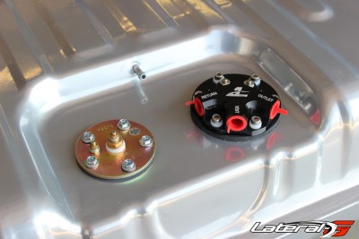 In order to fuel the motor – literally, we called the experts at Aeromotive. They set us up with with one of their new fuel tanks that comes ready to bolt in with a sending unit and fuel pump. These set ups are equipped with an Aeromotive 340 Stealth electric fuel pump that has 340 LPH of flow supporting up to 850 naturally aspirated HP. The tank also has an integrated baffling/tray system to keep fuel at the pump during hard cornering or acceleration. The pump itself is made with three AN ORB ports, one for feed, return and vent. The tank also comes powder coated silver and is slightly deeper than stock allowing for an extra few gallons of gas. We also utilized the Aeromotive post filter and fuel pressure regulator. We outfitted the regulator with an Auto Meter fuel pressure gauge so we will be able to keep tabs on fuel pressure. The entire system will be plumbed with Earl’s Hose and Fittings.