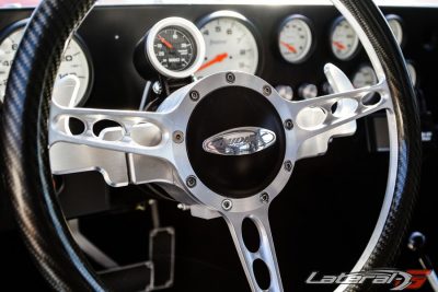 On the interior, the theme is carried through out. A custom sheet metal dash adorns a full cluster of Auto Meter gauges. Clayton Machine Works was utilized for door handles and the pedal set up while the Ididit column features a Budnik wheel and Twist Machine paddle shifters.