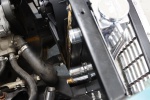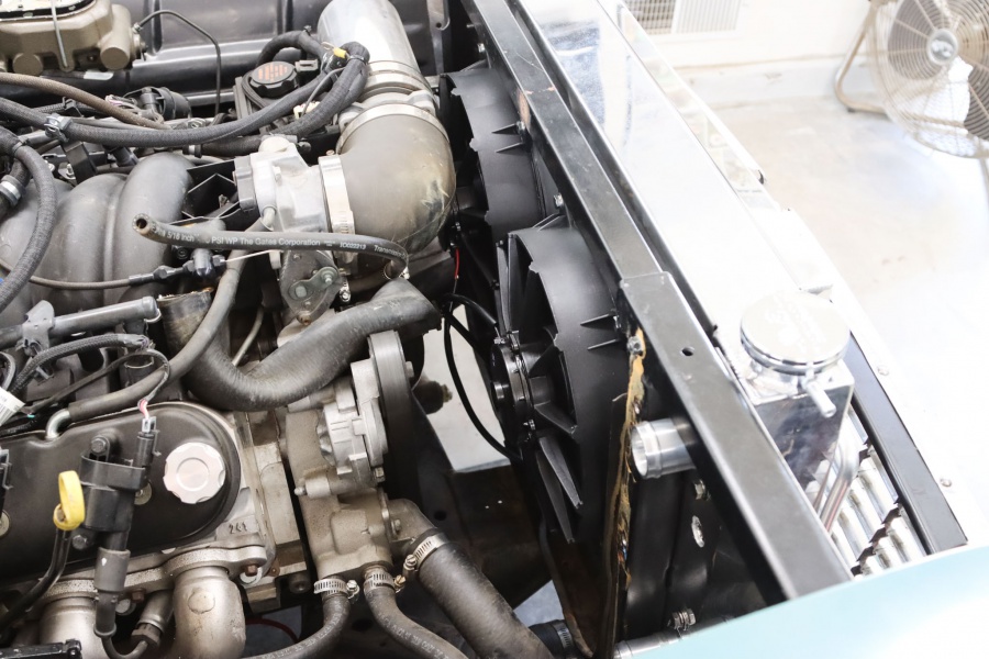 After that we slid the entire assembly into place and the radiator mounts to the new side baffles. With the radiator firmly in place, we then threaded in the petcock valve and threaded up the A/C lines that run from the condenser past the baffles to inside the engine compartment. Our last few steps were to wire up the fans, find some hoses at the local parts store, and fill the radiator up with the manufacturer recommended Peak Antifreeze and distilled water.