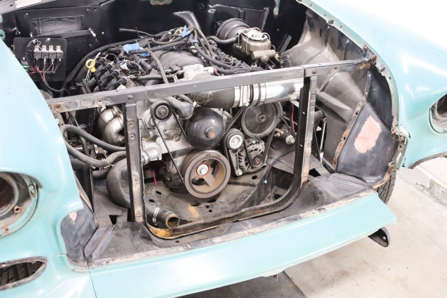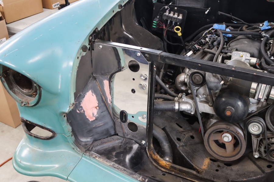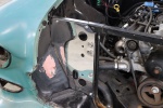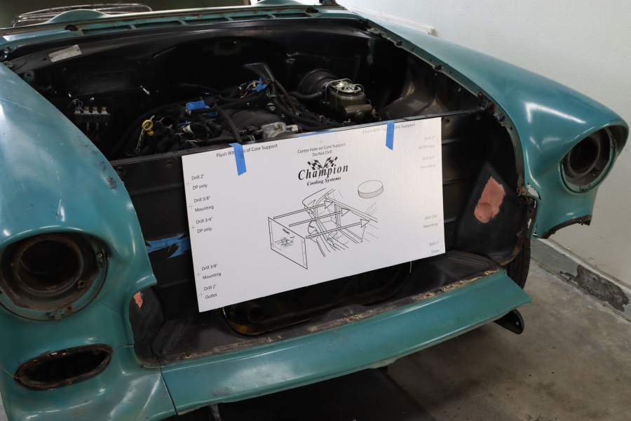 The first step on our end was to remove the current set up. That just required us to drain the radiator, pop off the hoses, and disconnect the cooling fan. The new set up mounts to the front of the core support like a Six-Cylinder car would; these tabs that stick out have to be cut off pretty much flush to the core support but that’s an easy task with a cut off wheel.