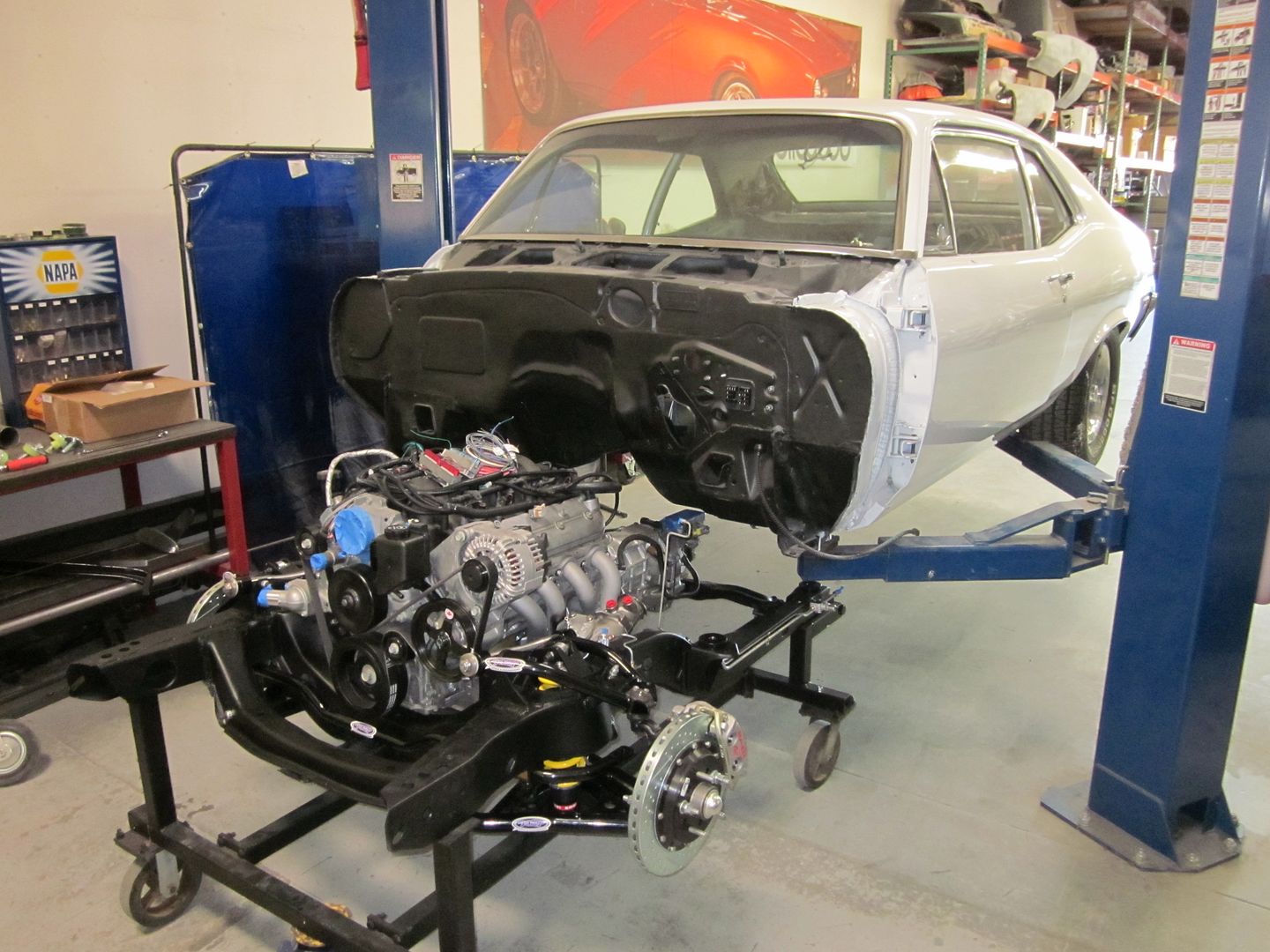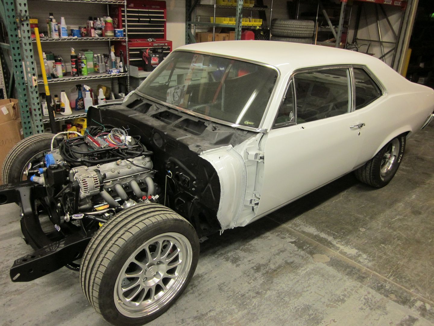 The 72 Nova is coming along nicely.. We got all the sub-frame assembled with motor & transmission.. Car is now on the ground!!