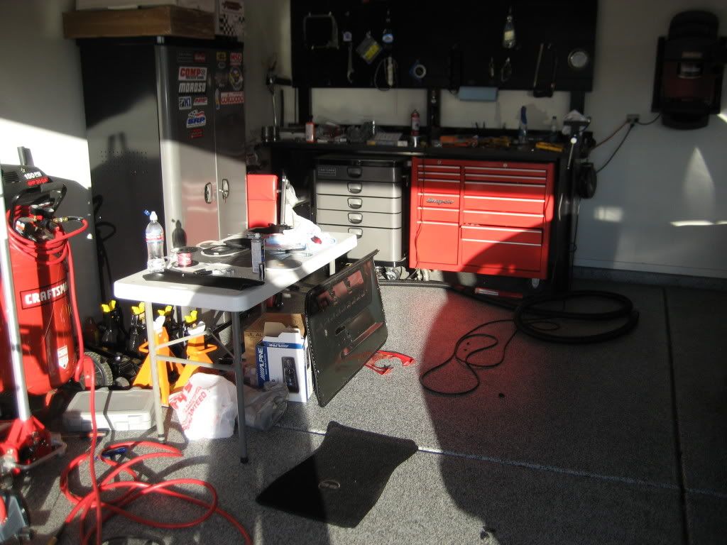 Well I decided that I have done enough work on my car lately. It's not finished but getting pretty damn close. When you garage looks like this, it's time to throw the seats back in and enjoy the fruits of your labor. I like driving it more than working on it anyway. I am a crew of one and this is the time to drive my car. It's comfy now and I have tunes. In the next few weeks I'll have a box built, carpet the trunk, and put in the back seat. My main goal was get it decent for the Sema fun.