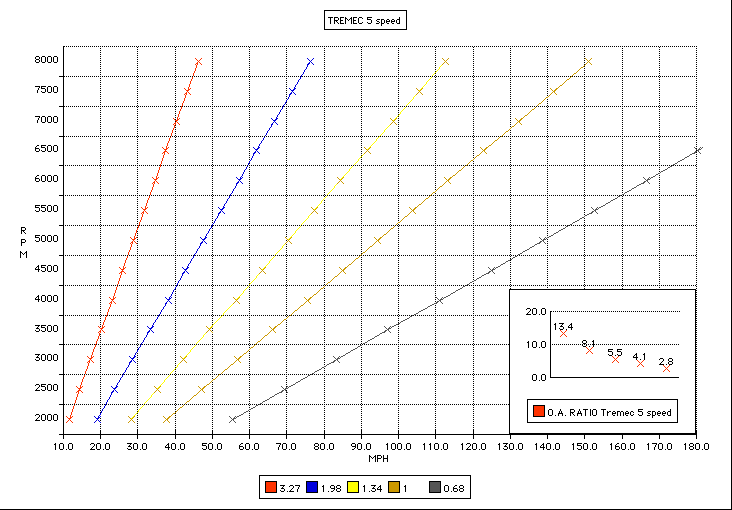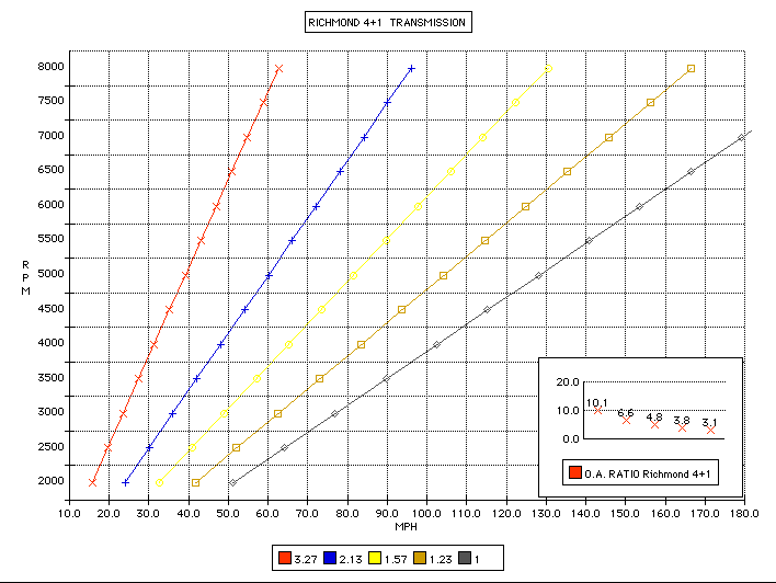 I love the closer gear spacing of the Richmond, but it MUST be used with a 3:08 rear gear or taller. I drove a BB Chevelle with a Richmond and 3:73 rear gears the gears were WAY too close and close gears are not needed with BB torque. You really feel this when just loafing along from a stop light and you are rowing through the gears just to get up to 65 mph. I think the Richmond is more suited to a small block, especially a higher revving small block. I have been told they are not as strong as the other choices out there. The Richmond has a 450 foot lb rating. This is probably a conservative rating allowing the trans to last many many miles. It does lack support of the gear train in the center which is where failures are reported. The main case splits in half so it's very easy to work on. 5th gear ratio is 1 to 1 so the drive shaft is not spinning faster than your engine. With your hp and torque, I'd look at a Tremec or T56, especially if you want to do hard drag launches. Common performance gearing for the T56 is 3:90, but you may want to gear a bit lower numerically. Here's a gear chart I did for our Richmond to plot shift points and rpm drops. Follow the chart to your shift rpm, then draw a line down to the next gear to read your rpm's you will be at after the shift. FYI, a new Richmond is around $1900. The Hurst shifter is another $300, plus shipping and tax, then add a new yoke. http://www.pozziracing.com/Media/richmond_chart.gif Here is a tremec for comparison. I did this chart a few years ago, so this isn't the newest Tremec model. Verify the gear ratios of whatever Tremec you are considering. http://www.pozziracing.com/Media/Tremec_chart.gif |