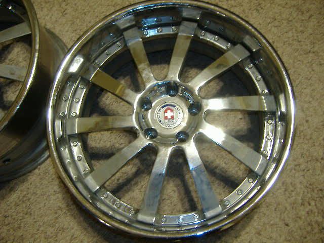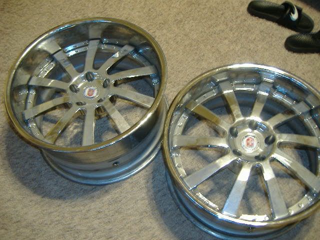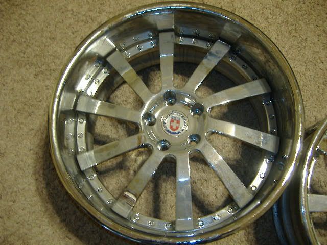 1) Brushed clear center with chrome hoops and leave the bumpers chromed. (I know how chrome is becoming less popular) 2) Brushed and tinted clear with brushed clear hoops and brushed bumpers. (My #1 choice) 3) Brushed/clear center with brushed clear hoops with brushed bumpers. (Less dimension if whole wheel is brushed clear) Basically, as you can see, I'm torn on the hoops. The centers will be brushed no matter what, rather tinted or clear. I've included a pic of what HRE's brushed tinted clear looks like versus their brushed clear. Brushed/cleared [IMG]http://i1122.photobucket.com/albums/...elle/brush.jpg[/IMG] The next two are brushed /tinted clear (adds a little dimension to the wheel) [IMG]http://i1122.photobucket.com/albums/...lle/hre2-1.jpg[/IMG] [IMG]http://i1122.photobucket.com/albums/...elle/tint2.jpg[/IMG] Lastly, here are a few shots of my wheels before I make a decision on the new finish. The are full chrome...maaaan, WTF was I thinking. :mad: :mad: They are dirty as hell from being in storage. [IMG]http://i1122.photobucket.com/albums/...e/DSCF0578.jpg[/IMG] [IMG]http://i1122.photobucket.com/albums/...e/DSCF0580.jpg[/IMG] [IMG]http://i1122.photobucket.com/albums/...e/DSCF0581.jpg[/IMG] |