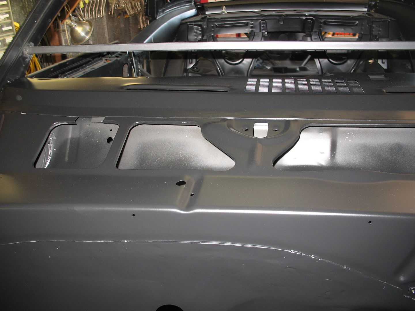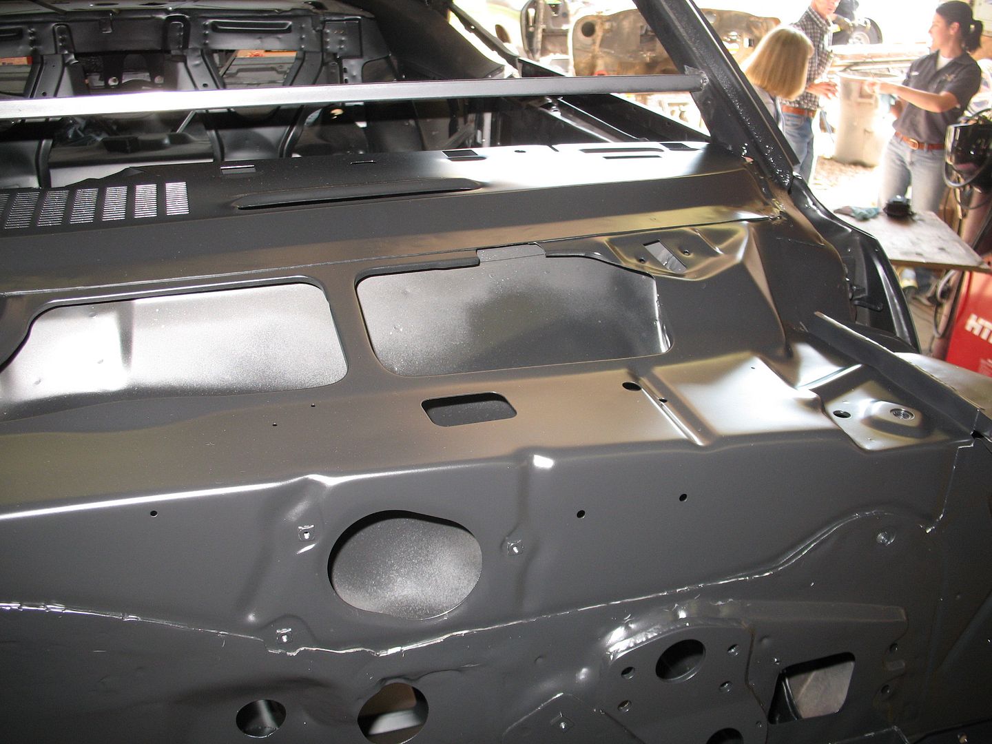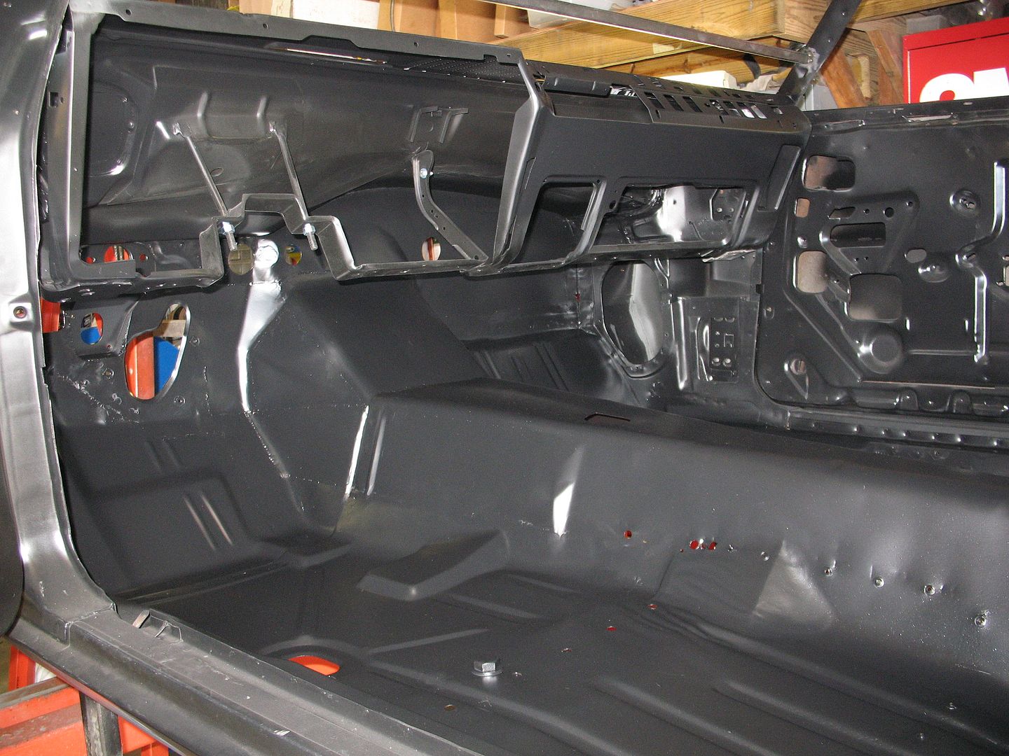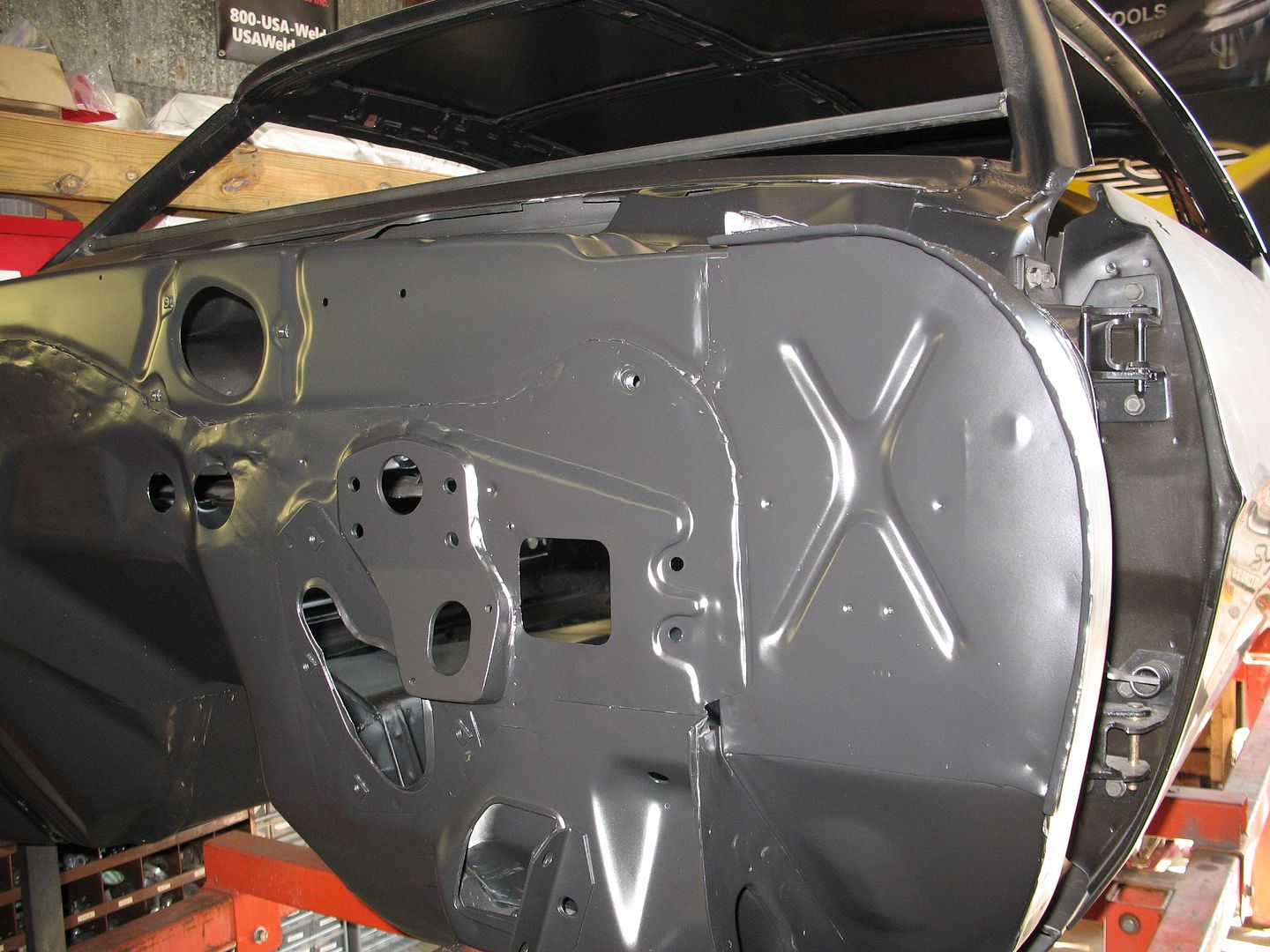 I know I've said it before but I really appreciate the fact that V8TV does all this work with the shell welded to their jig so things will all be nice and square when its done. http://i1140.photobucket.com/albums/...psf0c7b754.jpg Nick removed the inner and outer dash along with the upper firewall for replacement. http://v8tvshow.com/1969_Camaro_LC/s...9.21.12_55.JPG http://v8tvshow.com/1969_Camaro_LC/s...9.21.12_57.JPG The lower firewall flange was still in good condition. http://v8tvshow.com/1969_Camaro_LC/s...9.21.12_61.JPG http://v8tvshow.com/1969_Camaro_LC/s...9.24.12_04.JPG New dash and upper fire wall installed. A little more dolly work will make it all better than new. http://i1140.photobucket.com/albums/...ps09a71bc0.jpg http://i1140.photobucket.com/albums/...pscb8832d7.jpg http://i1140.photobucket.com/albums/...psb4118d4c.jpg The floors have also been repaired and look good. The trans tunnel mods are already done in order to clear the Magnum T56. Since the repairs in the floor are all butt welds, a little more weld clean up and dolly work will make the repairs virtually undetectable. http://i1140.photobucket.com/albums/...ps99a5c1fa.jpg |