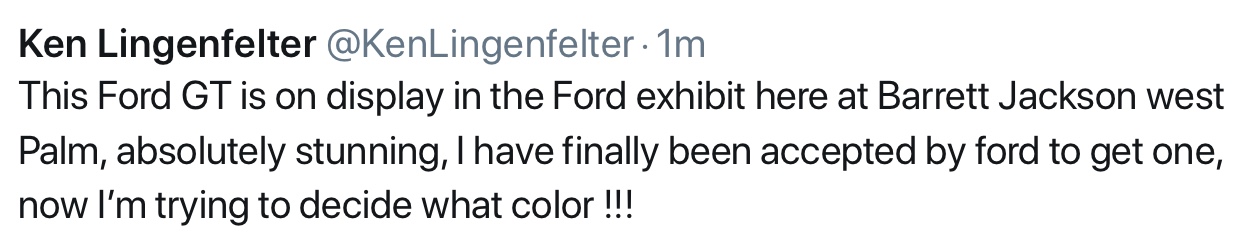 Looked at the black Ford GT at Barrett Jackson the other day. Black is not a flattering color for that car IMO. All the details of the body disappear. Notice in the pic above that huge air channel in the side of the body behind the door seems to disappear.