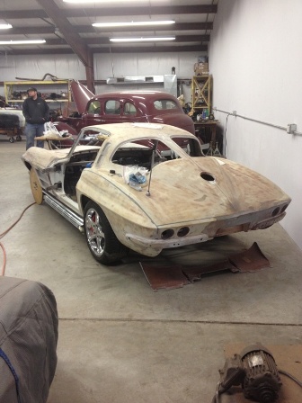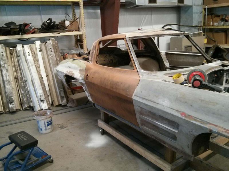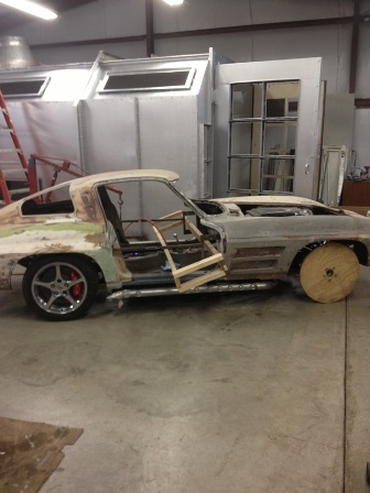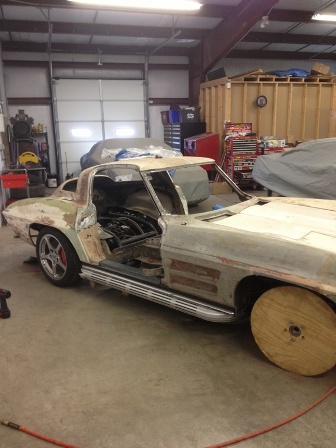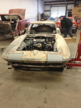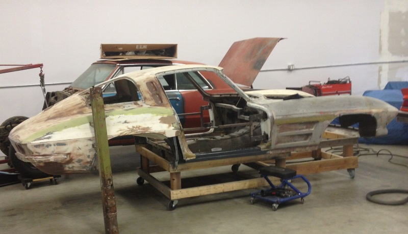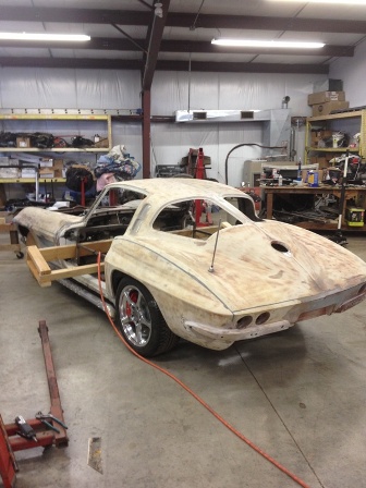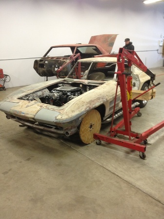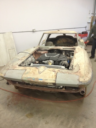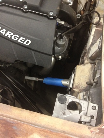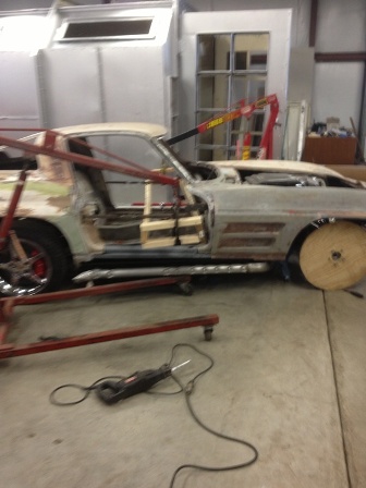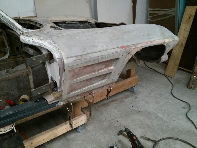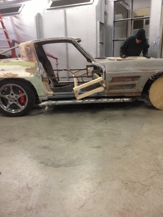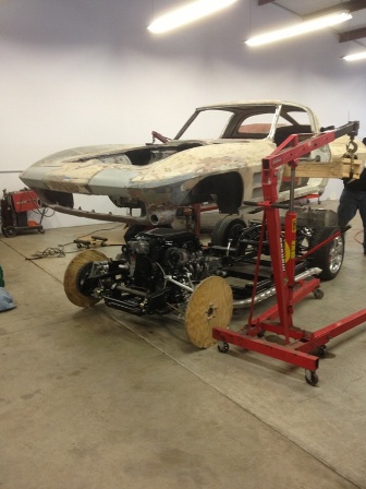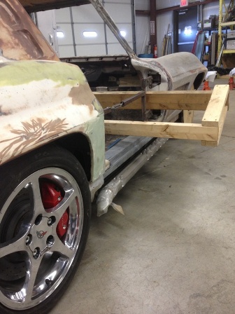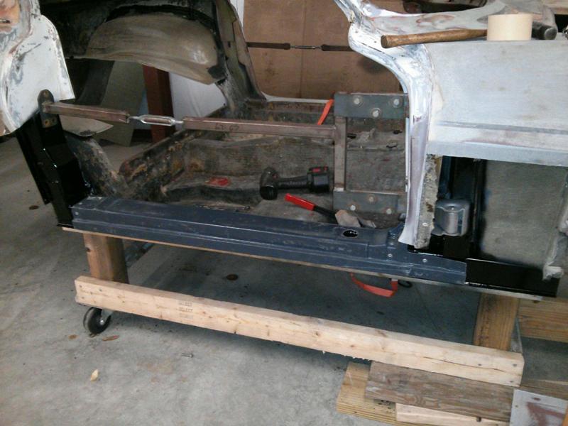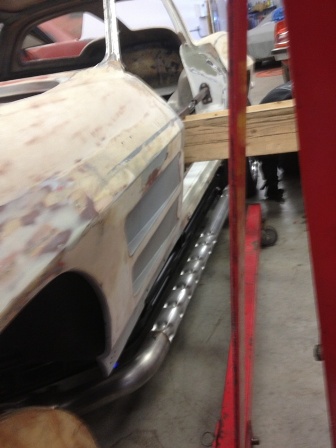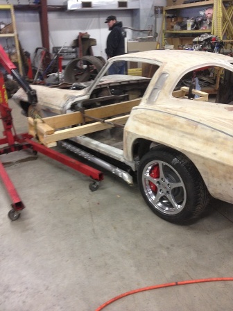 Didnt have access to lift, so a jig was made that fit thru metal attachments made for door opening and utilized 2 engine host to lower body on new chassis