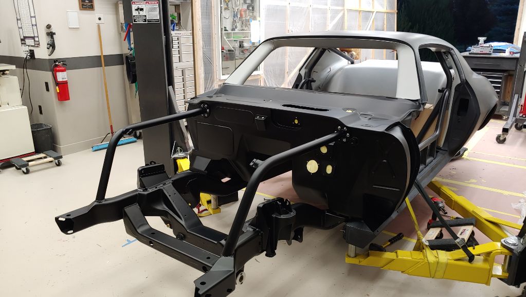 Getting the subframe painted so it can go on the car permanently. Taking a bit of a chance on the placement of the mounts for the bar that ties the front bars together but worst case they get relocated later.