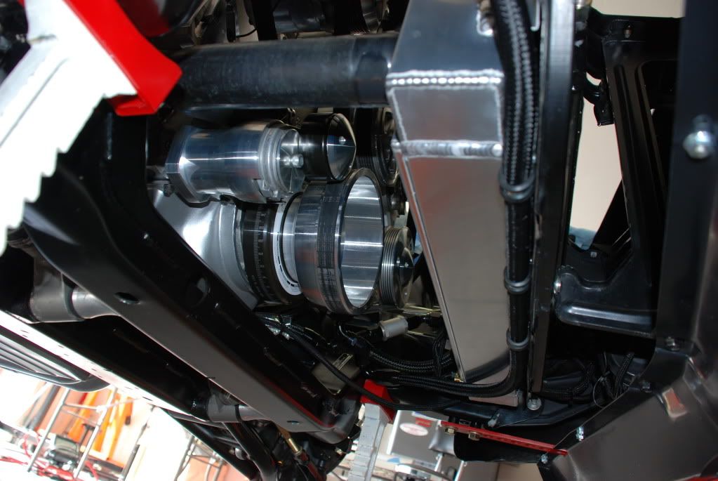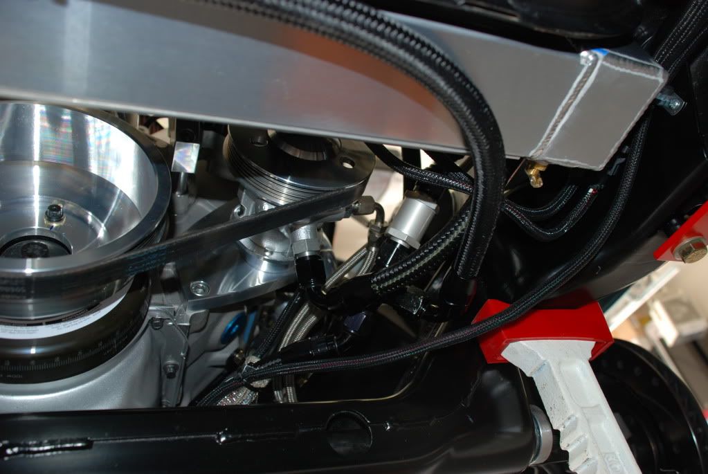Looks like Payback will be hitting the ground tonight. The bottom is done except for a couple fuel line and parts are being overnighted. This corner of the engine is a major nightmare and a brain teaser. I have 2 oil lines, oil sender, z bar, clutch fork return spring/bracket, steering knuckle/shaft, and wiring on top of 2 1/8" headers. :willy: I have everything protected and this is as good as it's getting. I'm happy with it. It's not as spacious as the Nikon leads you to believe. http://i200.photobucket.com/albums/a...mPhotos007.jpg In these three photos you can see the other rats nest in the front left hand corner. It includes oil cooler outlet, one way valve, t fitting, accumulator plumbing, power steering feed, power steering pressure/return, cooling fan wiring, alternator wiring, and probably something I forgot about. :lol: The hose you see running just below the radiator is my accumulator 10AN. It fit perfect right below the radiator and is out of the way of road debris. http://i200.photobucket.com/albums/a...mPhotos004.jpg http://i200.photobucket.com/albums/a...Photos2001.jpg http://i200.photobucket.com/albums/a...mPhotos004.jpg The starter area is no piece of cake either. I had to rotate the starter out one notch due to the block and I was lucky to have just enough clearance for my battery cable and solenoid wire. Tight! |
