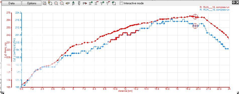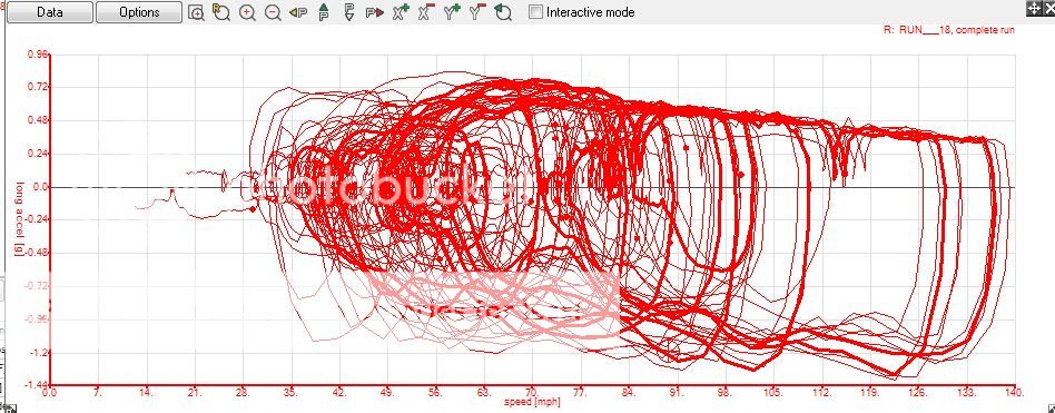 http://i439.photobucket.com/albums/q...ps8040715d.jpg The data shows I'm accelerating at about 0.85 G at 60 MPH and still pulling 0.6 G at 100 MPH. On the flip side I can generate 1.3 G decel at 120 MPH. Just fun to look at the data. On the temperature side this is the data from my last run the air temp was 85 degrees F. http://i439.photobucket.com/albums/q...psb39fcdf6.jpg After 15 minutes the water was at around 220 F and the oil was around 270 F. To road race a 900 ish car and to keep it cool is tough. I'm very happy with the data. Looking at the data the temps are becoming steady state and they will stabilize below peak excursion limits. Once I get out of the throttle look how fast it cools! Mark |