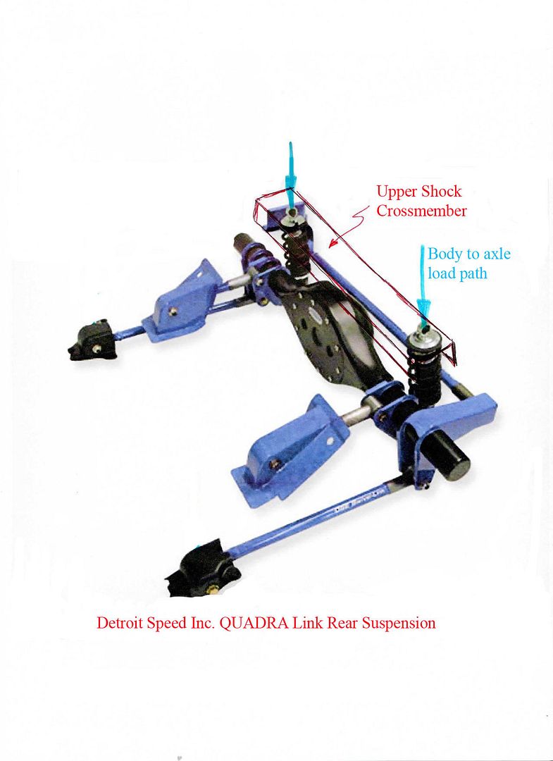 First, lets look at the stock first gen rear suspension. The blue arrows indicate the load path points between the rear axle and the body. http://i1140.photobucket.com/albums/...psdb424bc7.jpg Since we installed the Detroit Speed QUADRA Link rear suspension and mini tubs the load path between the rear axle and the body changed. The rear most location of that load path is now at the coil overs as shown in this sketch. http://i1140.photobucket.com/albums/...ps6e5bbc25.jpg In order to shorten the load path from the rear axle to the roll cage we decided to modify the rear drops of the cage as shown in this sketch. http://i1140.photobucket.com/albums/...ps77b249b4.jpg http://i1140.photobucket.com/albums/...ps89cd15f1.jpg Here's what that modification looks like in real life. Some high horsepower first gens. have been known to develop stress cracks in the rear quarters. While welded in frame connectors have a reputation of reducing the risk of stress cracks, we feel this modification might further reduce the chances of that happening. Short of doing a full blown finite element analysis of the entire system its hard to know for sure. Some might argue the weight of the fuel tank is less supported with these modifications. Most design decisions are trade off decisions. In the end, the fact that these mods will clean up the trunk so nice won out. Our reasoning included reminding ourselves that the factory structure was designed to handle the weight of the fuel tank without any assistance from a roll cage structure. To further clean up the trunk area we plan to mount the battery on top of the rear shock cross member. We will also mount our two II Much Fabrication vents, one for the gas tank and one for the rear axle, on top of the cross member. The V8TV crew re manufactured the rear drop bars so they closely followed the rear window opening. The goal on the whole cage install was to make it show up as little as possible as viewed from outside the car. http://i1140.photobucket.com/albums/...ps23b38c36.jpg http://i1140.photobucket.com/albums/...ps1162d503.jpg http://i1140.photobucket.com/albums/...ps502028be.jpg http://i1140.photobucket.com/albums/...ps5926ad89.jpg http://i1140.photobucket.com/albums/...ps0e9a6aa3.jpg http://i1140.photobucket.com/albums/...ps1e07bd75.jpg http://i1140.photobucket.com/albums/...ps40638c69.jpg |