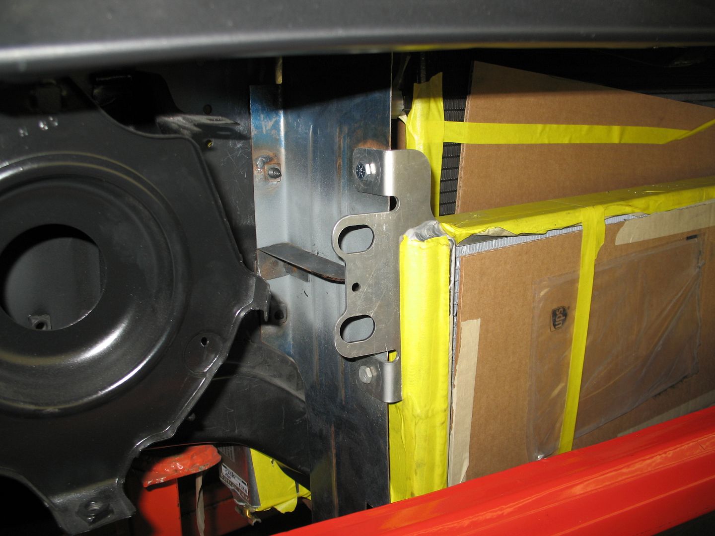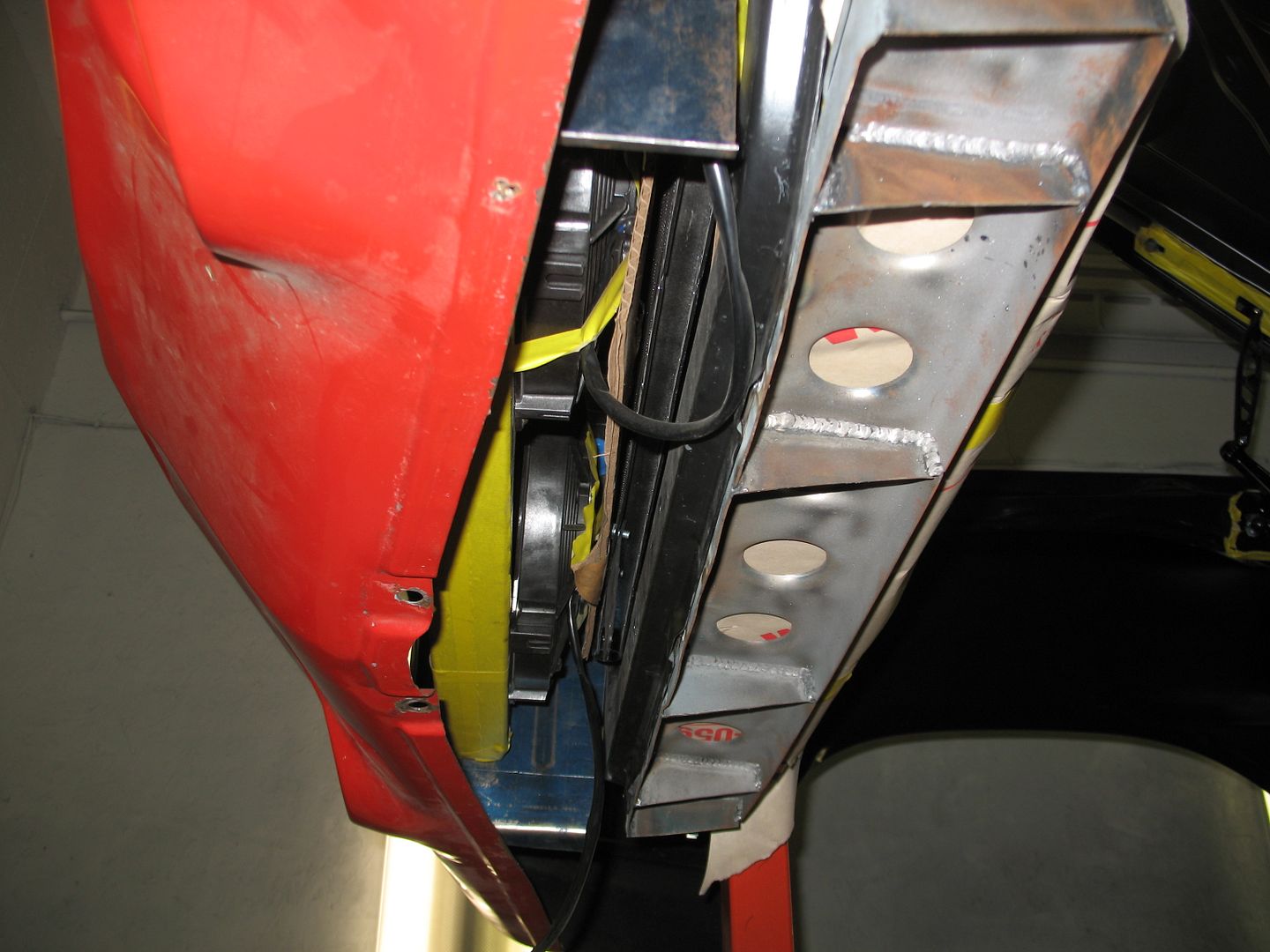 The parts being used include: 2nd Gen radiator module from C&R that includes two fans Vintage air A/C condensor Shelby 500 Intercooler with its own two fans. Volkswagen "THING" Hood latch It's all still a work in process but the fabrication of the various needed brackets is coming along. We'll post some more pics when the parts are further cleaned up and painted. We went with C&R's 2nd Gen. F body module instead of their drop in place 1st Gen. module simply because it has more total cooling area. Once the location of the radiator relative to the core support was determined a bottom support bracket for the radiator was fabricated. The yellow tape on the core support denotes where the window in the core support was enlarged to allow airflow to the whole radiator core. http://v8tvshow.com/1969_Camaro_LC/s...1.15.13_01.JPG http://v8tvshow.com/1969_Camaro_LC/s...1.15.13_02.JPG http://v8tvshow.com/1969_Camaro_LC/s...1.15.13_03.JPG http://v8tvshow.com/1969_Camaro_LC/s...1.21.13_16.JPG http://i1140.photobucket.com/albums/...ps55a43ccf.jpg The hood latch assembly was mocked up, bracketry made and then mounted. http://v8tvshow.com/1969_Camaro_LC/s...1.19.13_07.JPG http://v8tvshow.com/1969_Camaro_LC/s...1.19.13_09.JPG http://v8tvshow.com/1969_Camaro_LC/s...1.19.13_16.JPG http://i1140.photobucket.com/albums/...psabbc948a.jpg http://i1140.photobucket.com/albums/...ps7ecde247.jpg So.... it's starting to come together. Combination shroud / mounting brackets are now in place. http://i1140.photobucket.com/albums/...ps22c4098b.jpg http://i1140.photobucket.com/albums/...ps79844c78.jpg http://i1140.photobucket.com/albums/...psd9fdc81c.jpg Since we have so many fans, we want to use Pulse Width Modulation (PWM) fan control of the radiator fans instead of On/Off control. We don't want the car to sound like a vacuum cleaner unless it's really hot and we need all fans full on. There are numerous ways to setup PWM control of the fans. In order to figure out the best way for this application, I started a thread in the engines section of this forum. There is a lot of really good information and tips brewing over there in that thread. Here is a link to it: https://lateral-g.net/forums/showthread.php4?t=40215 |