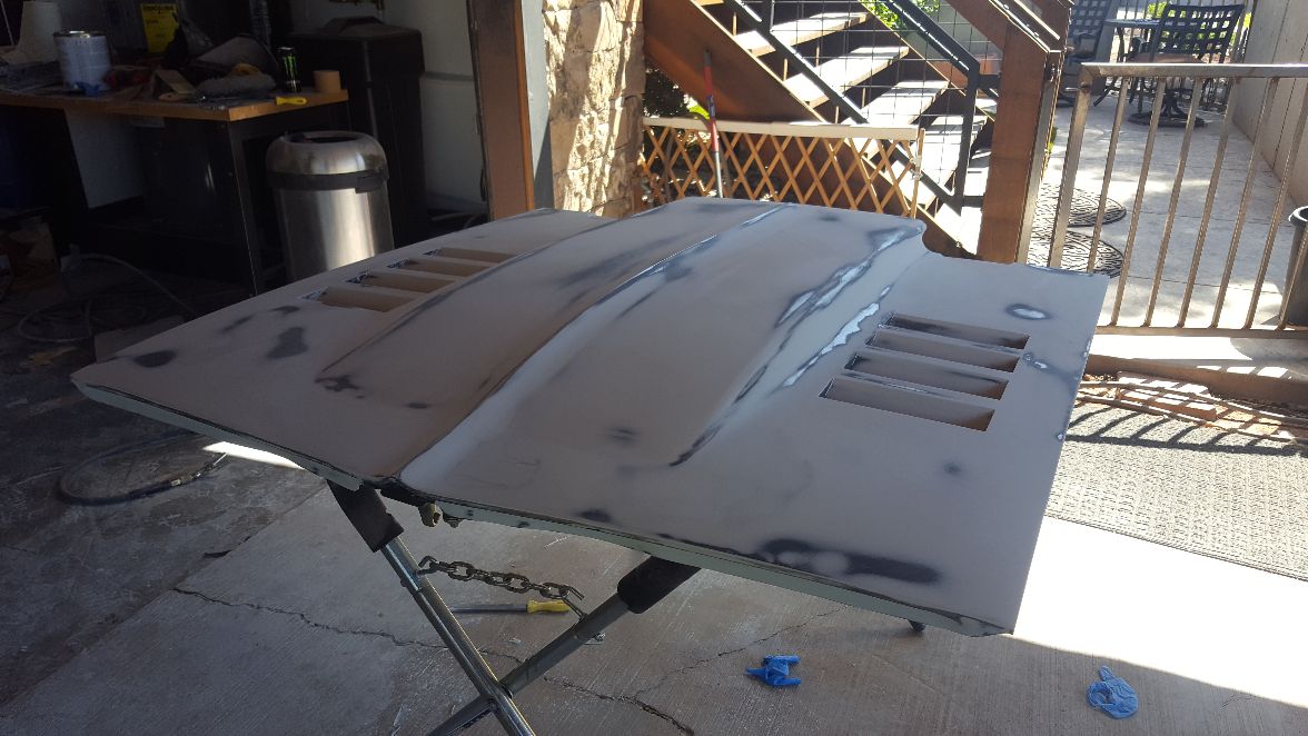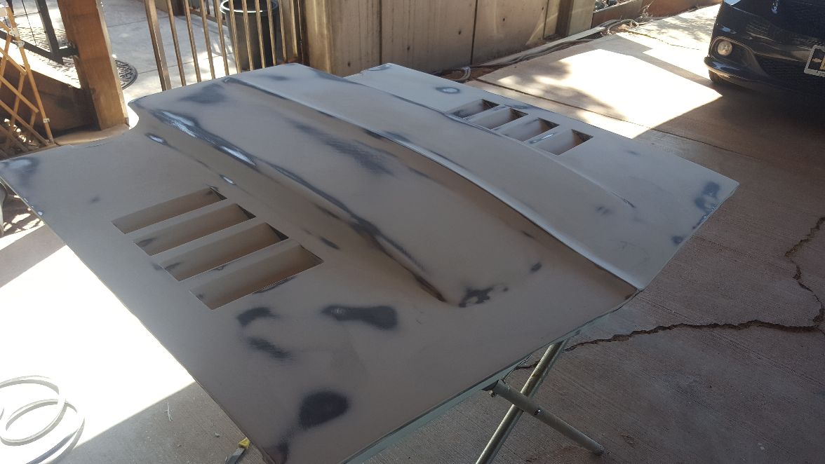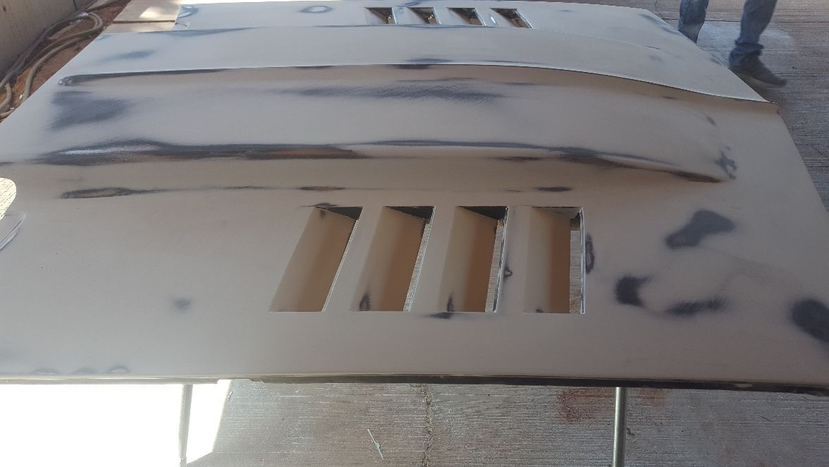 Top of the hood is now flawless with the Gray Area Steel hood louvers. Bottom is in epoxy primer and ready for body work.