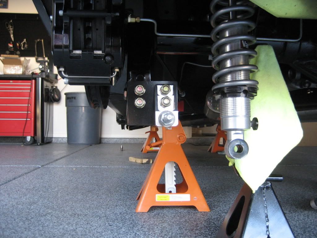 Ed...it's just 1/4 plate with rounded corners cut out of a water jet machine. I even had him cut the bolt holes with the water jet. Cost me under $30. The rear end housing is 1/8 plate. I'm not sure if it will effect the handling or have any other adverse effects yet. I do know that the stock setup will not work well in a racing or high load enviroment so you many as well change now. I really think it's axle end play that causes the issue now that I'm up to my eyes in brake pad knock back. It' really the easiest way to do it without any bind or a different length shock. I noticed the new G Link has the shocks mounted more vertical so that did give me the idea. I tried a set of mustand g bar lower shock mounts and the angle is off. I didn't snap any pictures before I mounted them. It moves the shock mount in 2". You could fabricate a new bracket that didn't move it in quiet as much but you would need to use a double sheer mount with a sleeve. I really don't think I'll experience any changes in ride or handling. |