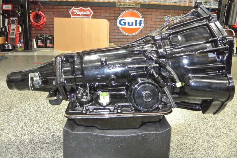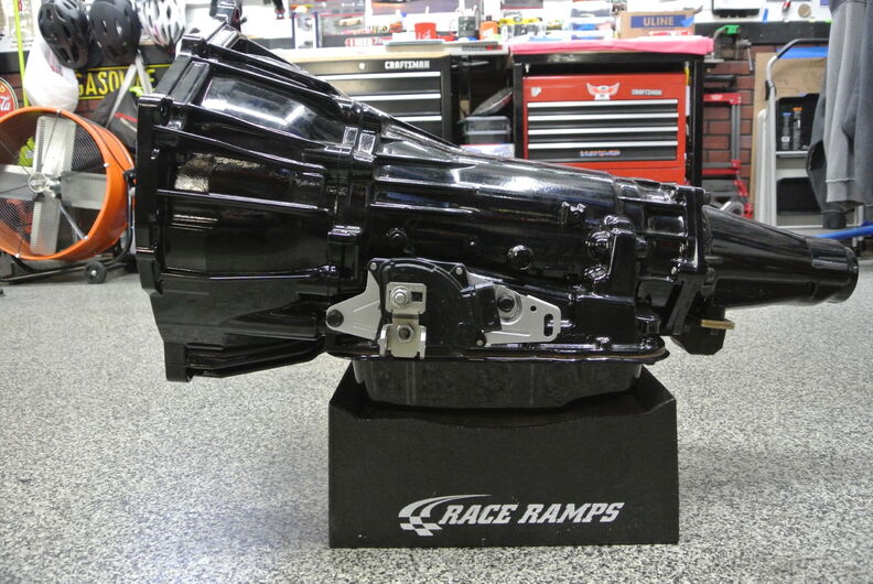When we built version 1.0 of the car it had a 700R4. Version 2.0 is getting 4L60e built by Atomic Transmission in Villa Park, IL. What I have learned is that the mounting position on the tailshaft is further back and the top of the case is a little fatter. Which means there is a a whole lot less room on the sides for you to reach up and install the wiring and tighten the coolant line fittings.