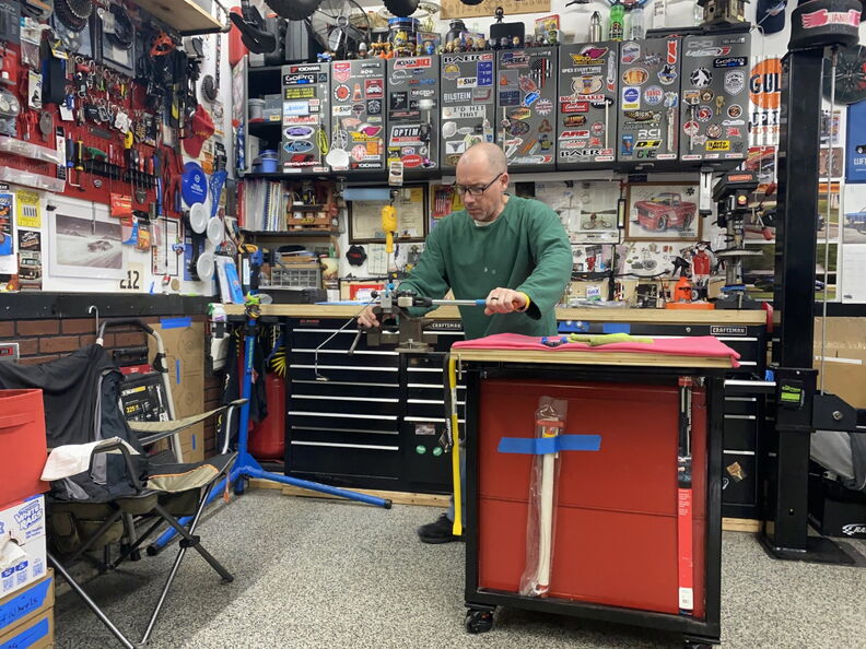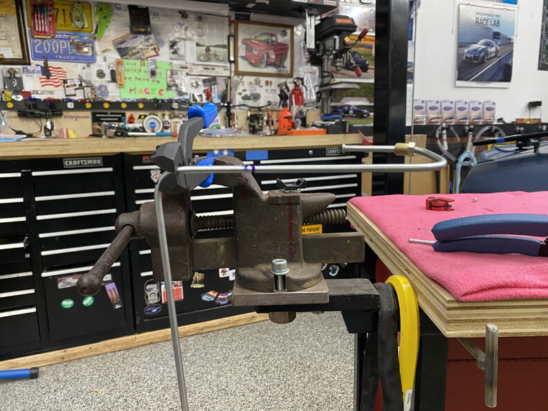 easy build. I plan to install a Knotchead line clamp under it to support it. http://www.garagescene.net/_data/i/u...d09f1c4-me.jpg http://www.garagescene.net/_data/i/u...e777d45-me.jpg http://www.garagescene.net/_data/i/u...af5e9c7-me.jpg Time to make the final line. Since I made reference marks on the practice line I used those to make the new line all in one piece and it turned out exactly how I wanted it. http://www.garagescene.net/_data/i/u...df0b308-me.jpg Yep, I kept practicing with the scrap pieces to help me learn where to line up the tools so I can get the desired bends. http://www.garagescene.net/_data/i/u...e4b2047-me.jpg So I was feeling a little bit ambitious and I gave it another crack on the crossover line on the subframe. http://www.garagescene.net/_data/i/u...54c9daa-me.jpg I needed an extra hand so I put the brake line bender in my Grandfathers Vice and wow was this a total game changer it was like having Mike in the garage helping me. http://www.garagescene.net/_data/i/u...80e7394-me.jpg http://www.garagescene.net/_data/i/u...179c939-me.jpg I just realized the sweatshirt that I am wearing in this picture was the last gift I received from my Grandmother before she died in 1989. It had moved with me many times over the years and I never wore it. A few years back I pulled it out and decided I would finally where it. http://www.garagescene.net/_data/i/u...f86dbaf-me.jpg http://www.garagescene.net/_data/i/u...b5fd26e-me.jpg Using the reference marks I made allowed me to duplicate the final line all in one piece. I also traced out the line with sting so I new exactly how much line was necessary. It would have sucked if I had started with a 60" line as this line turned out to be 62" in length. http://www.garagescene.net/_data/i/u...da81bf1-me.jpg http://www.garagescene.net/_data/i/u...2f9d0d4-me.jpg The final flare and yes the fitting is on !!! http://www.garagescene.net/_data/i/u...5472f4e-me.jpg http://www.garagescene.net/_data/i/u...1bc1f5b-me.jpg The tape makes the line not look centered but it is actually almost perfect. http://www.garagescene.net/_data/i/u...452887e-me.jpg |