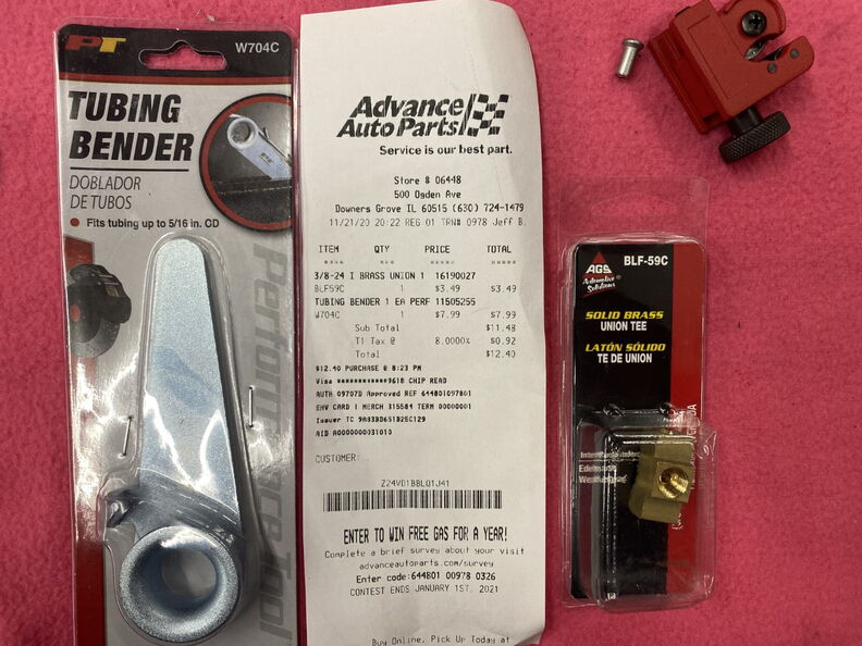 http://www.garagescene.net/_data/i/u...99ad451-me.png http://www.garagescene.net/_data/i/u...21a77c9-me.png Here we go again. As you can see I was practicing the bends that each tool was able to do and making reference marks on each piece so I would have a much better chance of bending the lines exactly where & how I want them to turn out. http://www.garagescene.net/_data/i/u...09c0b53-me.jpg More practice bends http://www.garagescene.net/_data/i/u...77c5563-me.jpg http://www.garagescene.net/_data/i/u...ca73c65-me.jpg http://www.garagescene.net/_data/i/u...de6cd5b-me.jpg You can see the refence marks on the line. http://www.garagescene.net/_data/i/u...062802a-me.jpg I used the string to determine exactly how much brake line I will need to make the desired piece. http://www.garagescene.net/_data/i/u...6662a75-me.jpg http://www.garagescene.net/_data/i/u...6661fb8-me.jpg http://www.garagescene.net/_data/i/u...7381341-me.jpg http://www.garagescene.net/_data/i/u...470272f-me.jpg http://www.garagescene.net/_data/i/u...0456e99-me.jpg http://www.garagescene.net/_data/i/u...53af238-me.jpg http://www.garagescene.net/_data/i/u...d6d3dbf-me.jpg Back to the Autoparts store. http://www.garagescene.net/_data/i/u...a190087-me.jpg |
