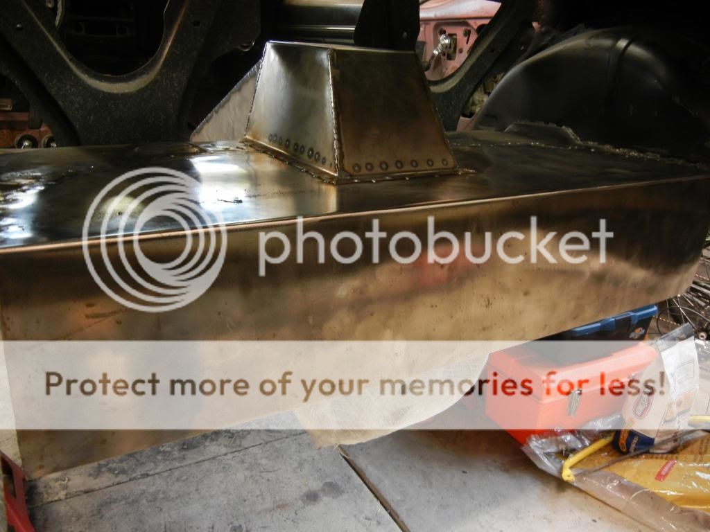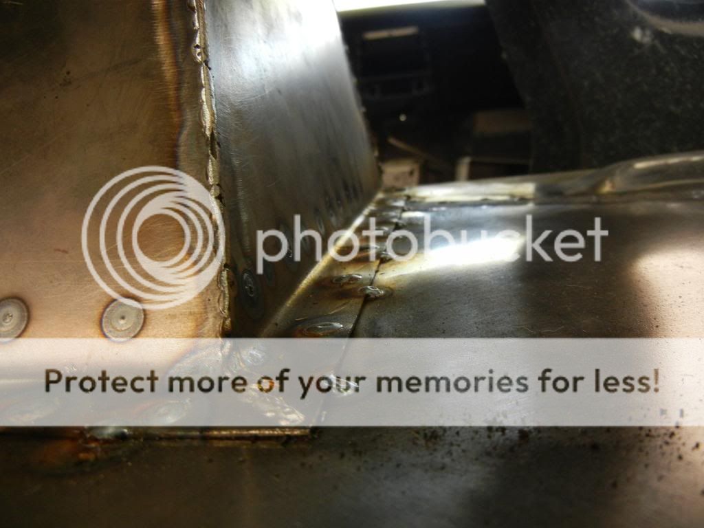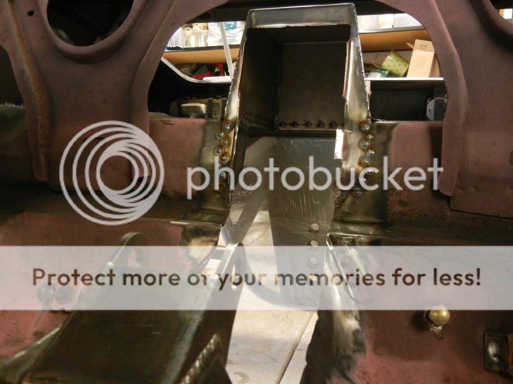 Noodled around a bunch of ideas, including what James did in cutting a tunnel out of another car (t-bird I think) and I looked at using a Harley FL front fender. Almost did that, but once I cut the rolled edges off the fender it was way too flimsy. So, what I wound up doing is what you see below. Pretty simple. I just struck a template off the fwd edge of the upper trailing arm mount, transferred that to the end of that 6" wide sheet and put a gentle bend it it to land it on the top of the rear doghouse. http://i490.photobucket.com/albums/r...pse303eee0.jpg As you can see, the sides aren't symmetrical. Because neither is the tunnel so that made forming the sides a bit troublesome. This presented another, among many opportunities to discover that my wife is much smarter than I am. So I'm kneeling inside the cabin of the car, whittling away at a sheet of poster board trying to make a template that matches the nutty bunch of contours from the fwd x-member all along the pan/tunnel, and up onto the fwd face of the rear doghouse. Cut-curse-mark-cut-curse-mark-cut-curse-mark.... So Kathy pokes her head into the car and says "why don't you use a piece of wire and bend it to all those contours and then transfer that to the posterboard?" In less time than I'd expended nibbling away at the paper, I drove to Lowes, bought 8' of solid core copper ground wire (a bit larger dia than coat hanger wire but more pliable, I forget what gauge) bent it, transferred it to paper and it fit pretty close to perfect. http://i490.photobucket.com/albums/r...ps71bc7802.jpg So there is the part tacked in place at the top & bottom, you can see a bit of light peeking in the gap, but it's tiny. A few nudges with a body hammer from beneath closed those up tight. BTW, the gizmo to the right is a "Gorilla Torch", it's made by a company called JOBY. The legs articulate and will wrap around almost anything and the feet are magnetic so it can be placed just about anywhere. Comes in really handy when there isn't enough ambient light to see what you are doing through the auto-darkening shield. Especially when welding under the car as you can focus the beam right where you are trying to weld allowing to to see perfectly before beginning the weld. Quite a bit of yoga required to weld that part in, but despite that I was able to do some ok work. http://i490.photobucket.com/albums/r...ps931f39cd.jpg http://i490.photobucket.com/albums/r...ps1a8e81ca.jpg Adequate given my meager skill set and experience. So. Up next is front suspension install (v2.0) and assembly of the rear end housing...... |