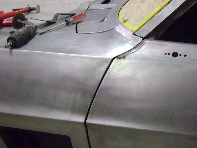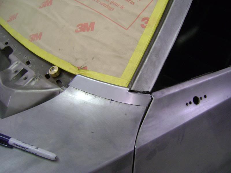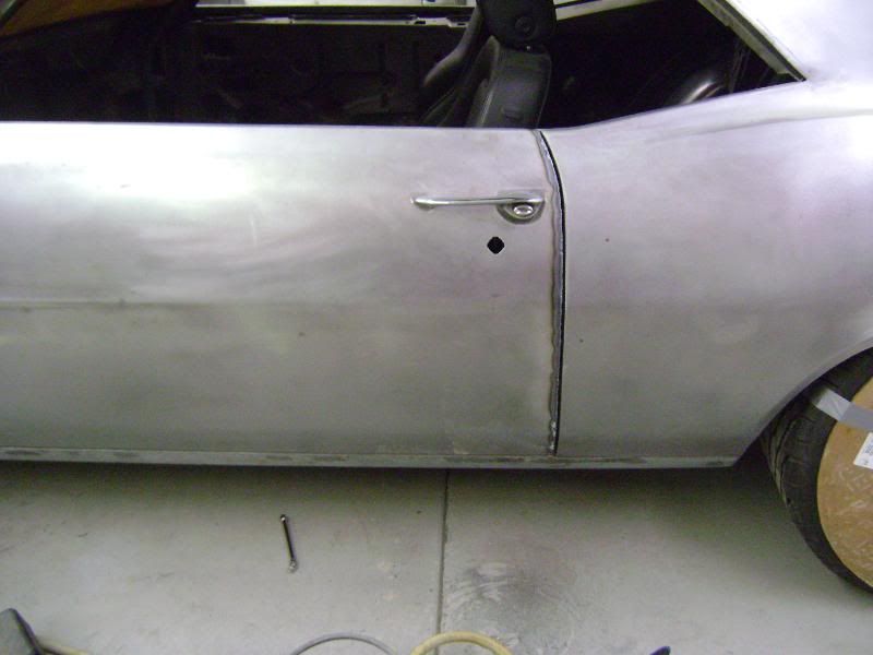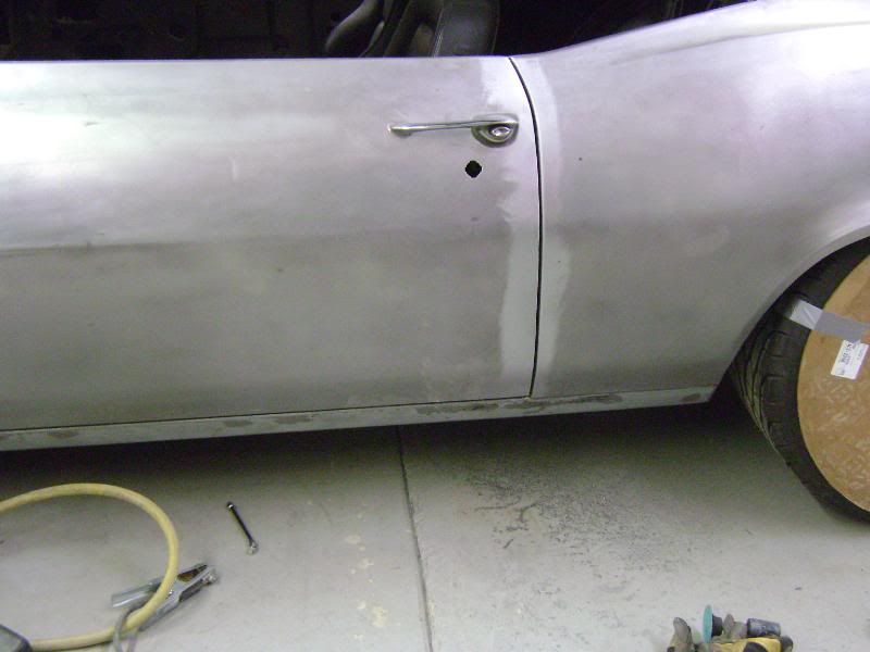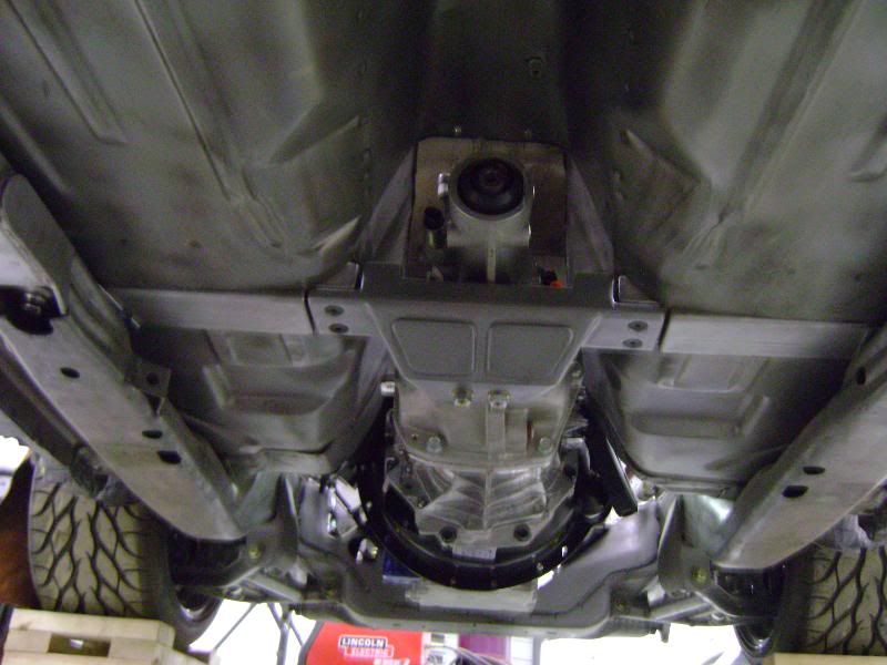 the engine fianlly showed up and we got her sitting in the car and started working on the trans crossmember. also extended the fenders and cowl up to the windsheild and started gapping the doors and fenders...