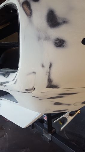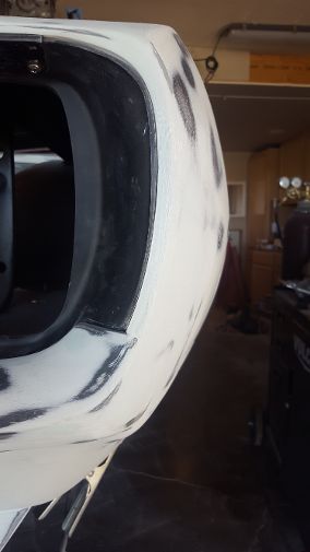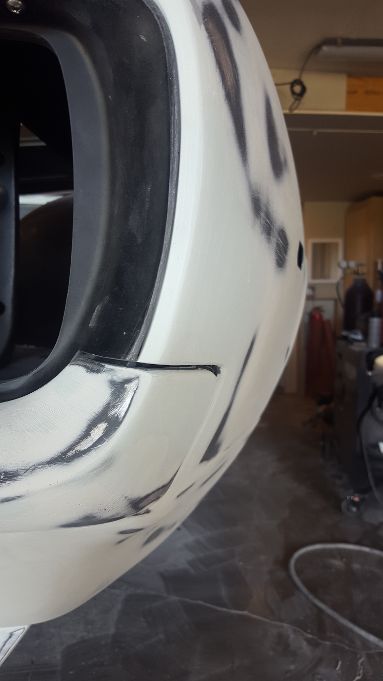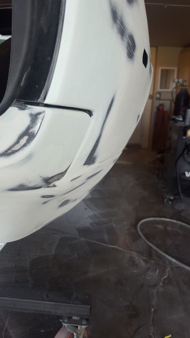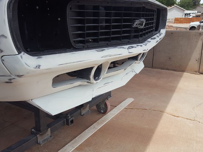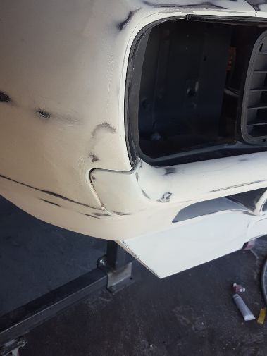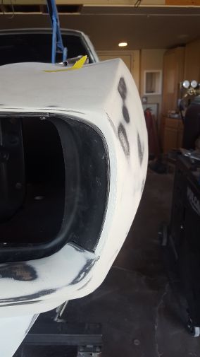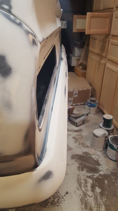 Well that was a little more work than I thought, but the "fangs" are perfect. We used masking tape to make a template of the drivers side"fang" and then reversed it for the pattern of the passenger side "fang". Although the majority of work was done to the passenger side, we ended up working both of them to get them the same. We are really close, probably another 10-15 hours of final prep work before my guy lays down the polyester.