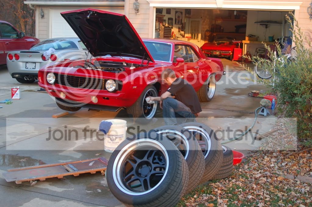 So undaunted we loaded it up Sunday morning and took it back to Gingerman race way for the last testing. http://i439.photobucket.com/albums/q...l/DSC_3220.jpg http://i439.photobucket.com/albums/q...l/DSC_3219.jpg The car is working great! They had us on the new longer course so the lap times aren’t comparable. We were blowing by C-6 Z06s like they were sign posts. Lots of fun. I ran the car hard and only found a couple small problems with ABS calibrations and high speed track use. After logging about 50 miles on Gingerman we had to take the car back to the VanNus's house to clean it up and fix more paint chips. Joe did not look impressed. lol I took his perfect car and trashed it again. We were lucky with a very good weather so we washed it out in the driveway. http://i439.photobucket.com/albums/q...l/DSC_3224.jpg http://i439.photobucket.com/albums/q...l/DSC_3222.jpg We had a small pile of rubber under the car after we scraped off the wheel wells. When I left Paul and Joe were touching up paint chips again. Sorry guys. :thumbsup: The car leaves for SEMA today. The car looks better than it did in June. :hail: Stielow |