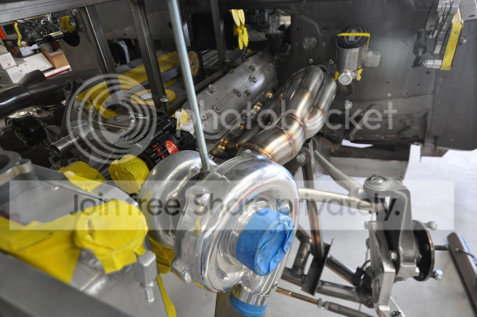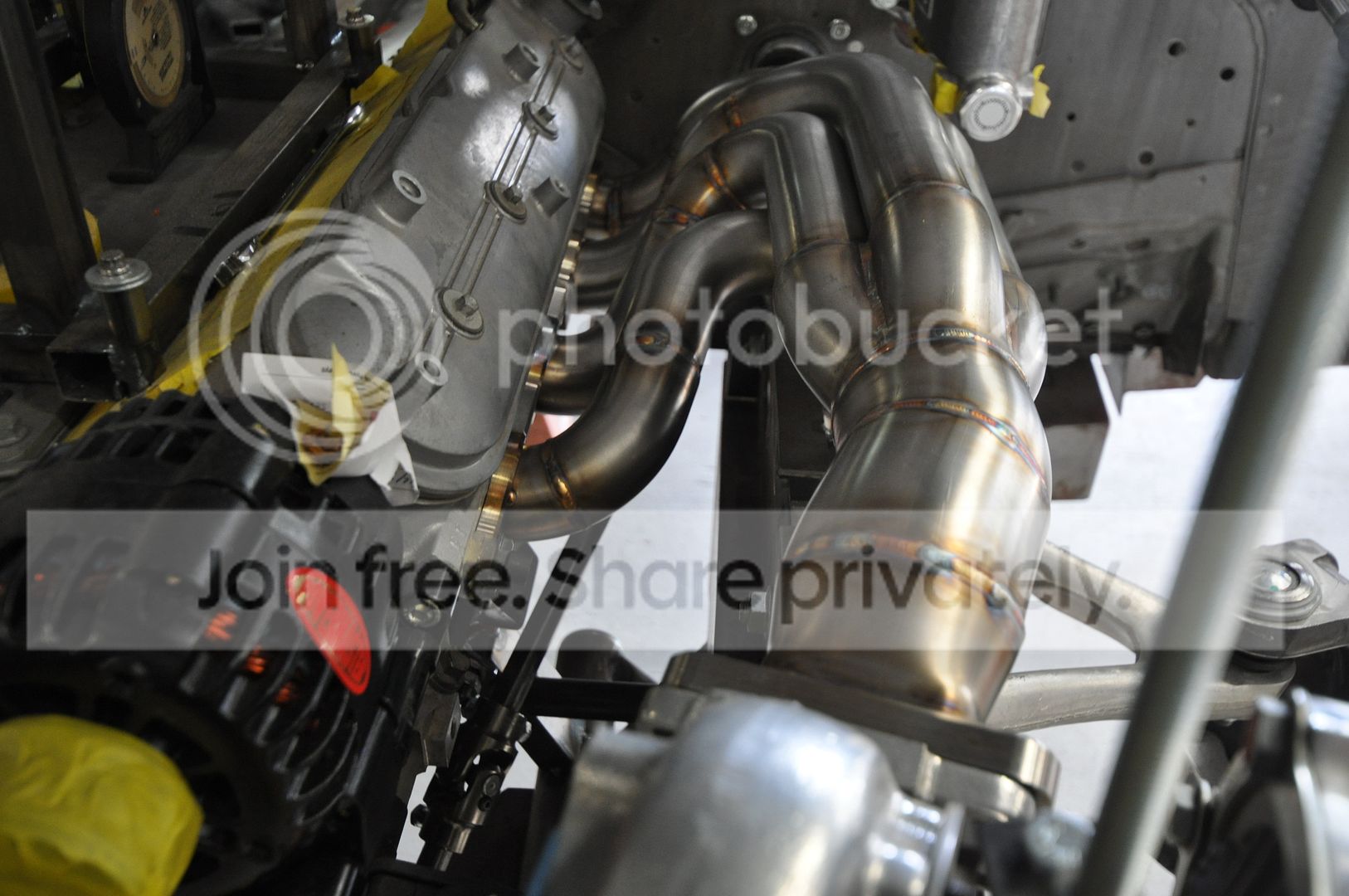 Here is a sneak peak of the Twin Turbo engine getting the basic layout for the exhaust plumbing. We are working with Kurt Urban Performance and Eric Turner for a bitchin twin throttle body water to air intercooled cross ram for the engine. The stock plastic manifold has to go.