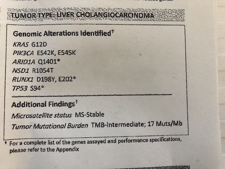 https://www.foundationmedicine.com/g...foundation-one $6,500 or so will get you a comprehensive result for which drugs will, or have, had good results with chemotherapy..... or if there are clinical trials specific to your type of cells.... or any other useful information that might help guide the docs (mostly yourself) to some form of treatment(s). I had hoped mine would come back with a specific "mutation" that KEYTRUDA treats..... but no such luck. At least I know. This is a 62 page 'report' -- but the box on the front page is all that is important initially...... and sadly mine sucks. FIRST identifies mutations and markers....... Attachment 66026 Sorry it's hard to read the columns ---- but basically it matches these mutations or markers with any KNOWN chemo treatment that works on it -- or clinical trials - Targeted therapy, etc. There are many TYPES of cancer -- Lung - Liver - Bone - but what's IMPORTANT is what cellular makeup is the cancer ---- because then you can really drill down on finding something known to be effective on THOSE CELLS !! Attachment 66027 |