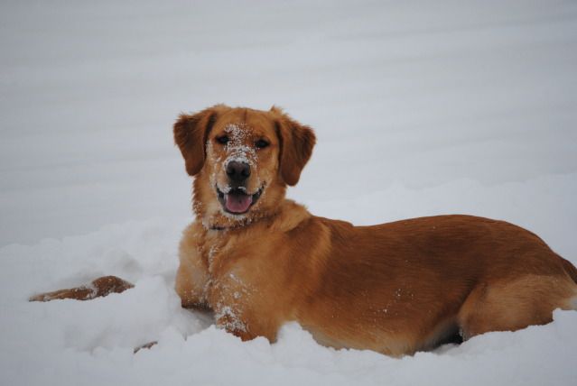 Other than she's quite happy with us -- and us with her.... not too much to report. Still to this date only one pee accident.... NO chewed up car or furniture... As long as she can SEE the ball in the snow (orange) she can fetch it - but it's spring time and if the ball sinks -- Then I fetch. She's pretty good with the frisbee and she's a good snowshoe companion... provided there's no other dogs to run off and play with. |