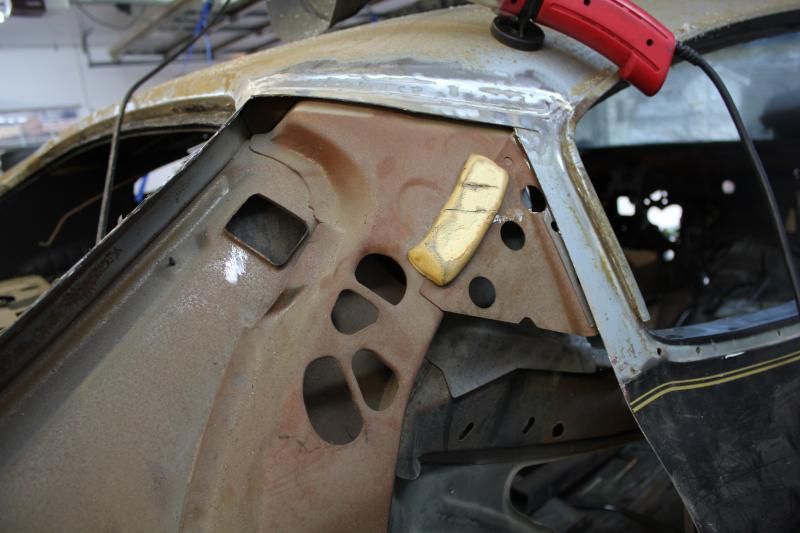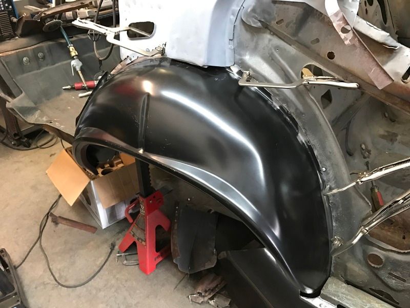 Ok, so a long day repairing some areas in the trunk and some inner sheet metal. So the inner fender is ready to be welded on. All clamped up and a few screws holding it in.