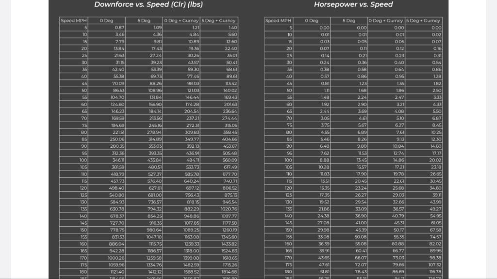 I have a Gurney flap on mine and on T-Hill the first time out I was seeing about 125mph on the front straight and avg speeds of just under 80mph and minimum speeds of about 50mph. So look at 50-130mph or even more specifically 80-130mph with a girney flap for likely downforce numbers. But with the top mount and larger optimized endplates I’d say from what AJ had published another 15% is likely.