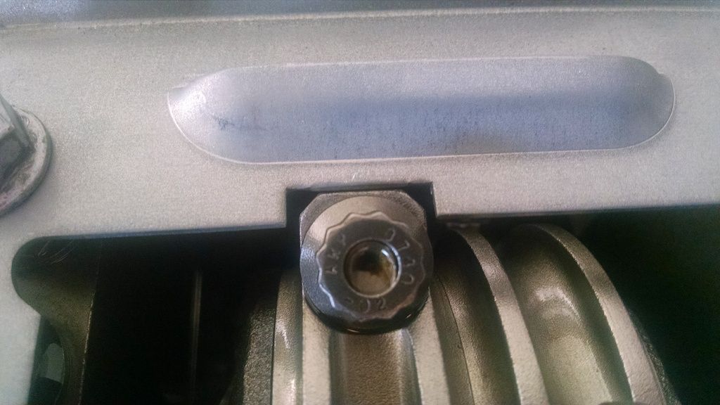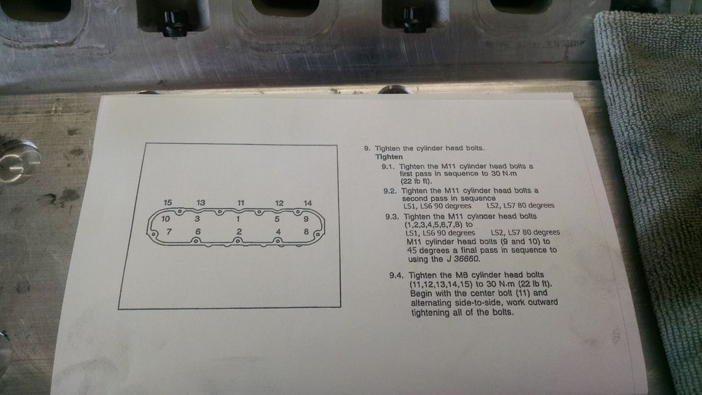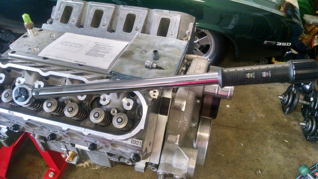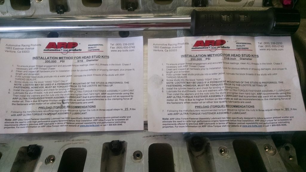 ARP says to put their assembly lube on the threads, both sides of the washers, and the bottom side of each nut. http://i632.photobucket.com/albums/u...nstall/266.jpg http://i632.photobucket.com/albums/u...nstall/268.jpg http://i632.photobucket.com/albums/u...nstall/267.jpg Once that's done, it's time to start the torque sequence. ARP calls for 80 pds on the large studs and 25 on small ones, done in a series of 3 steps. I started the large studs at 28, then moved to 56, then finally to 80. The smaller, I started at 8, then 16, then finally 25. http://i632.photobucket.com/albums/u...nstall/271.jpg Using the following torque sequence obtained from Lingenfelter, I began the process. http://i632.photobucket.com/albums/u...nstall/270.jpg http://i632.photobucket.com/albums/u...nstall/269.jpg http://i632.photobucket.com/albums/u...nstall/273.jpg http://i632.photobucket.com/albums/u...nstall/272.jpg And, after about two hours, the finished product. http://i632.photobucket.com/albums/u...nstall/274.jpg |