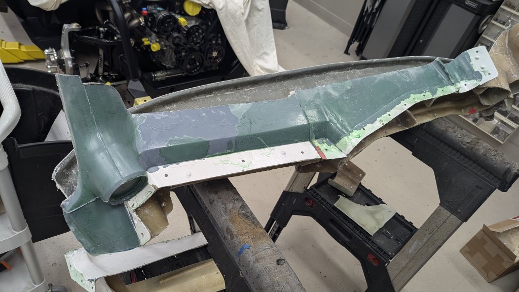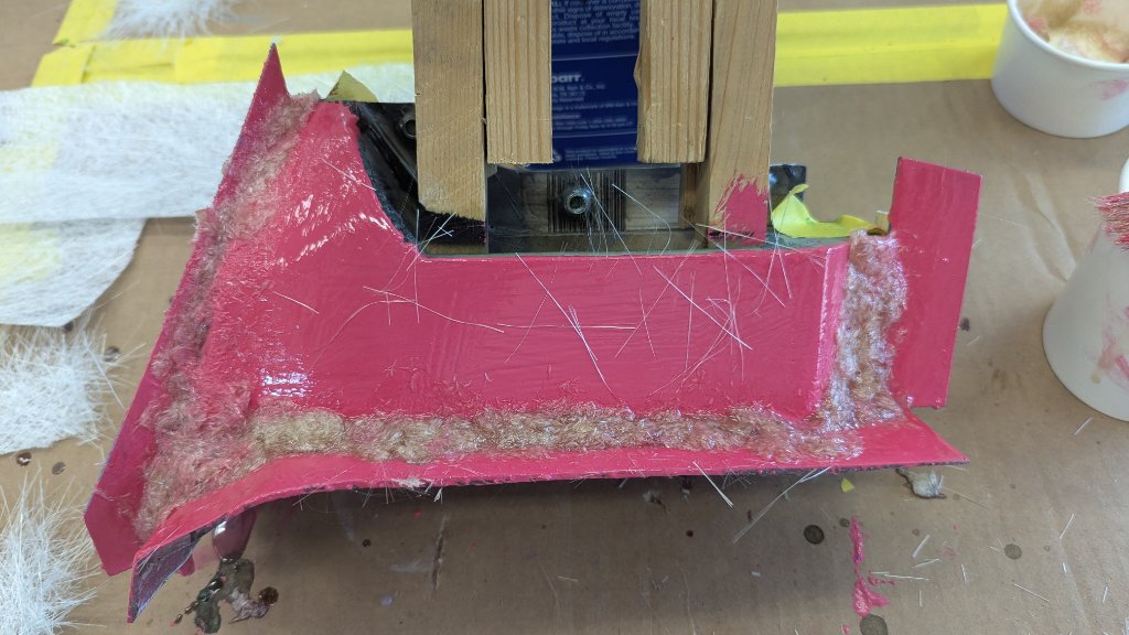 Attachment 81766 You just mix it with catalyzed resin, ending up with a wet paste and then brush it into the corners. Quickly and rough, no science. Attachment 81767 Then lay mat on top of that and squeegee out the air bubbles with a brush and a roller. This will force the paste into the corners and small areas. You can see it here, sorta darker. But note how the mat is very flowing and there aren't hard bends. This will be very solid with no air pockets. Attachment 81768 |