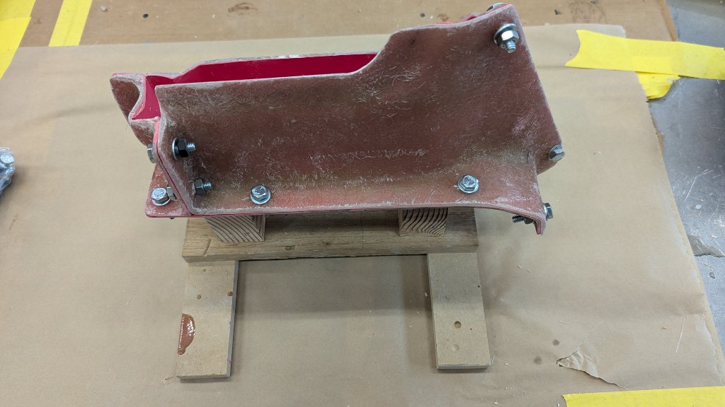 Why brush instead of spray? Less cleanup, faster but for sure will introduce small air bubbles. If this was a mold for a body panel or something that we wanted perfect gelcoat, spraying is the only way to go. I will spray the gelcoat for the actual parts, like in previous pics. Attachment 82140 Those little bumps are just sticky back cabinet bumpers, they create alignment pins so the mold sections go back perfectly. Yep, brushing gelcoat upside down is a mess and isn't perfectly flat but for a mold that will likely make one part or even 20 parts, absolutely fine. Attachment 82141 Done in multiple sections so it will come apart later, if it was done in one or even 2 sections, given the angles of the part, the mold could get trapped and it wouldn't release. This is the first 2 sections. Attachment 82142 |