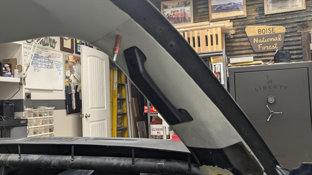 Hand grabs anchored. Mounting brackets welded to the cage, will modify the A pillar cover to give a bit more room for your knuckles, after the dash and kick panels are completely anchored. These make it easier for these old bones to climb over the mini door bars.