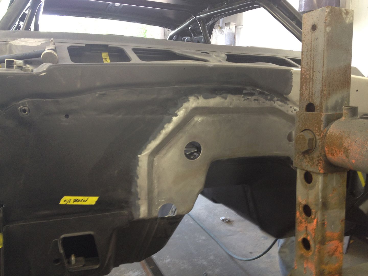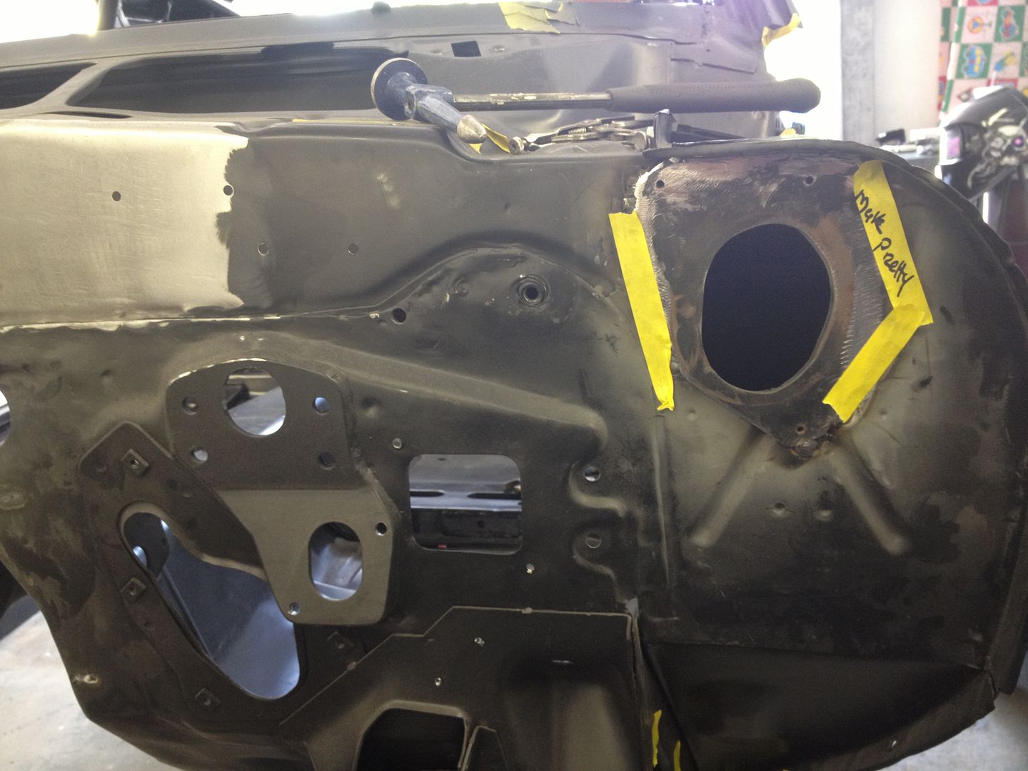 The car is now disassembled again and off to body and paint!!!! I stopped by to see how things look. Both Kevin and Kelle were off on a business trip so Adam was showing me the work he just completed on the firewall. He created a recessed area in the firewall to provide a little more engine clearance on the passenger side because the DSE frame and motor mounts position the LSA as far back as possible. http://i1140.photobucket.com/albums/...ps679596e0.jpg Trevor had relocated the DSE windshield wiper motor and pump to inside the driver side fender so the original mounting location was filled in. http://i1140.photobucket.com/albums/...psc66edfad.jpg As Adam was showing me his latest work he explained that he was now in the process of going over the entire car, inside and out grinding, welding, and massaging all the fabrication and repair areas to make them undetectable. He mentioned that as he works, Kelle is constantly inspecting, sticking pieces of yellow tape that explain the things she isn't totally satisfied with yet. He wasn't complaining at all. It was more like boasting about how thorough they are in their work even though it can be very tedious. He said it typically takes about four rounds to get Kelle's final stamp of approval. Of course, as the customer, that was music to my ears. I read some of the notes on the yellow tape and realized they were things I probably would have missed...... and I'm a real stickler for details. One of her notes really got my attention: As I said earlier, the new wiper motor mounting location is under the driver side fender where no one will ever see it. Even so, her little note in that area said "make pretty". It's comforting to know the people building your car are holding themselves accountable to do top quality work, even in areas no one will ever see. Thanks to Kelle for setting the V8TV quality standard and thanks to the team for meeting it!!! http://i1140.photobucket.com/albums/...ps8b47c1fd.jpg |