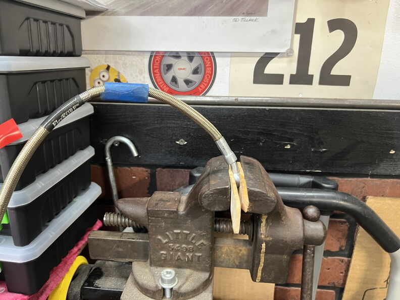 Here is a picture of the Drivers Side and it doesn't leak. http://garagescene.net/_data/i/uploa...d59d2f7-me.jpg Here is the Passenger side and you can see it is resting on the caliper body. http://garagescene.net/_data/i/uploa...8bfd750-me.jpg http://garagescene.net/_data/i/uploa...a4c6413-me.jpg Once again this line is coming off and being bagged. http://garagescene.net/_data/i/uploa...fc340db-me.jpg Back to my Grandfathers vise. http://garagescene.net/_data/i/uploa...711e4e9-me.jpg http://garagescene.net/_data/i/uploa...d063759-me.jpg 2nd Attempt as the 1st one was not successful. http://garagescene.net/_data/i/uploa...f3ae95d-me.jpg Looks like it's going to work. http://garagescene.net/_data/i/uploa...b712983-me.jpg http://garagescene.net/_data/i/uploa...8202659-me.jpg Line is back on and I will try to bleed the brakes again tomorrow. http://garagescene.net/_data/i/uploa...ef0f44f-me.jpg http://garagescene.net/_data/i/uploa...3546558-me.jpg |