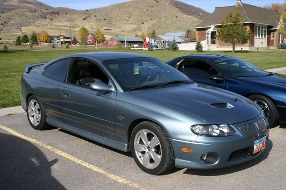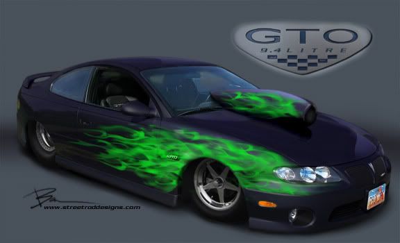 I did this one a while back for a GTO buddy. First thing was to eliminate the background and factory rolling stock (duplicate original layer, delete original layer, pen tool-trace area to be deleted/paths/make selection/activate car layer/delete). Then I removed the factory hood scoops (rubber stamp, blend, blur, and airbrush tools) and changed the car color (hue/saturation). Next was to select (pen tool) the wheels and tires, then the scoop from the Mustang and copy then past on a new layer. The front wheel needed only minimal tweaking (edit/transform) but the back wheel and scoop needed a little more work to look like the correct size and perspective. The wheels are on a layer below the car, the scoop on a layer above it. Finally came the airbrush tool to paint on the flames, highlights and background and the emblem was modified to say 9.4 litre and dropped on an new layer.