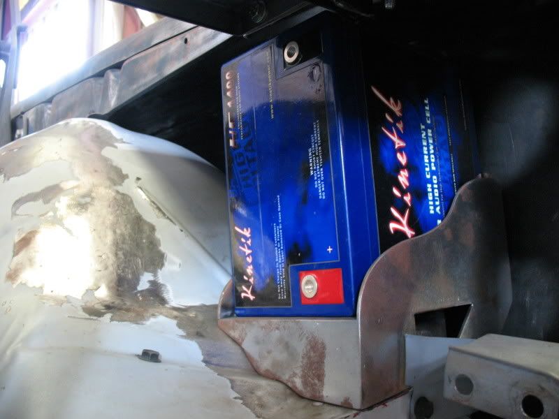 The owner has plans for a huge stereo in the trunk and asked if we could fit a battery hidden away in the front engine compartment somewhere, so this is what we came up with: