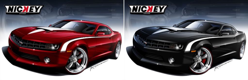 I remember Dennis asking me about the side stripe that I would need to draw on the Nickey Camaro. We talked about the existing one that we've seen on the GM concepts. I said to him "We're not doing anything like that stripe, to me it looks like a big PORK CHOP or side burns on the sides of the new Camaro...." They look hideous in my honest opinion. Again with the "different". See quote above. http://i250.photobucket.com/albums/g...ine/stripe.jpg I went with what you see on the current drawing. I had already sketched that stripe like that when I did the 5th Gen Camaro rendering what-ifs for PHR magazine and everybody thought they looked good and clean. So I stuck with that on the Nickey car. I will be helping Stefano and Dennis do the final 1:1 side stripe graphic artwork for their production cars. I can't wait to see one done! J |