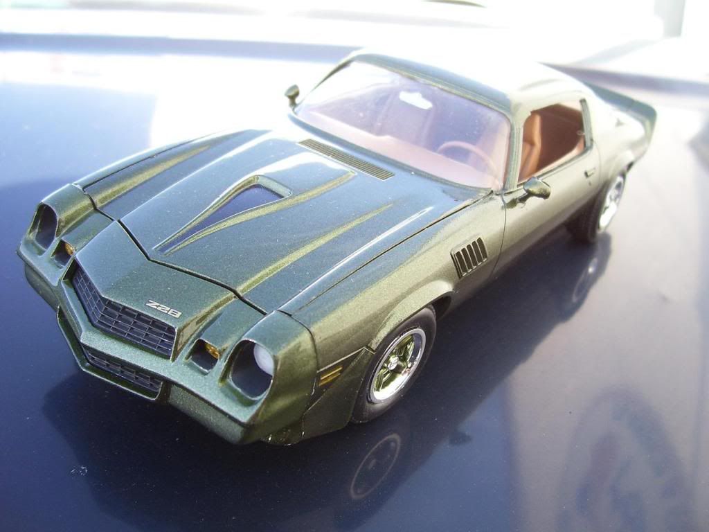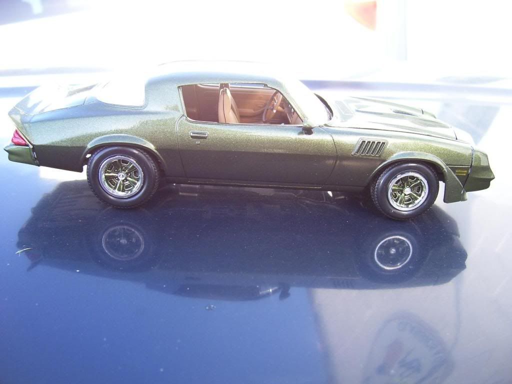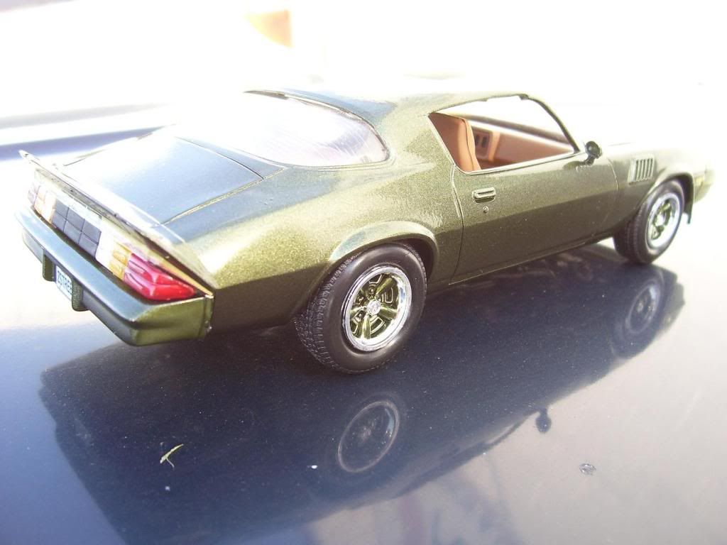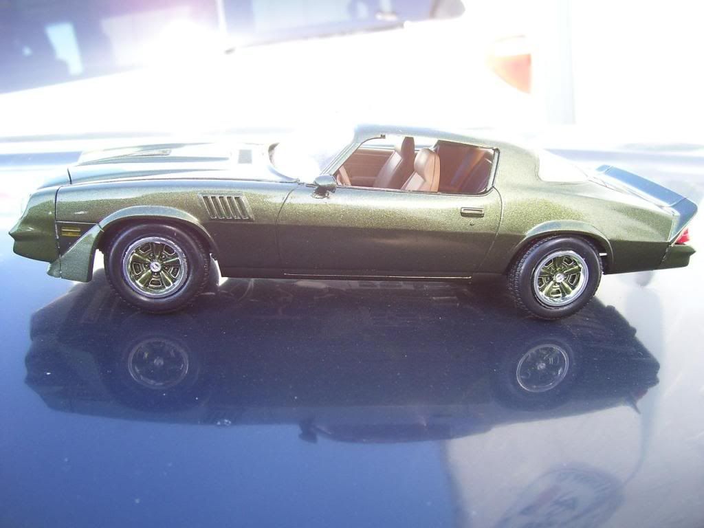 I took the decals off today and took some new pics. I also painted the wheels body color. It was pretty sunny today so the metallic on the model is real apparent. The finished car will not have as much metallic. I had to spray very thin very light coats so not to melt the plastic. The reducer in the base color would melt the model if I sprayed it as I would the car. When you do light dusting sprays with metallic paints, you get a lot of metallic. Anyway, the car looks good without stripes too. I may throw a pair of '70 Z28 grille emblems on the fenders when shes all done. Let me know what you guys think now that you can see it without the stripes.