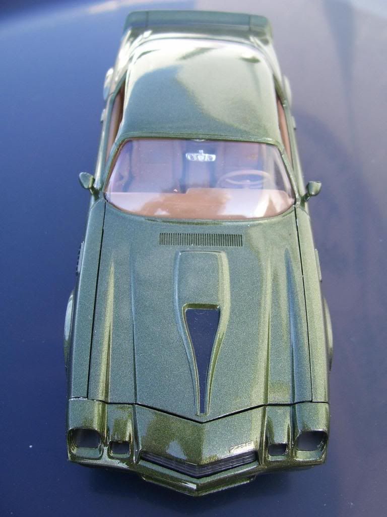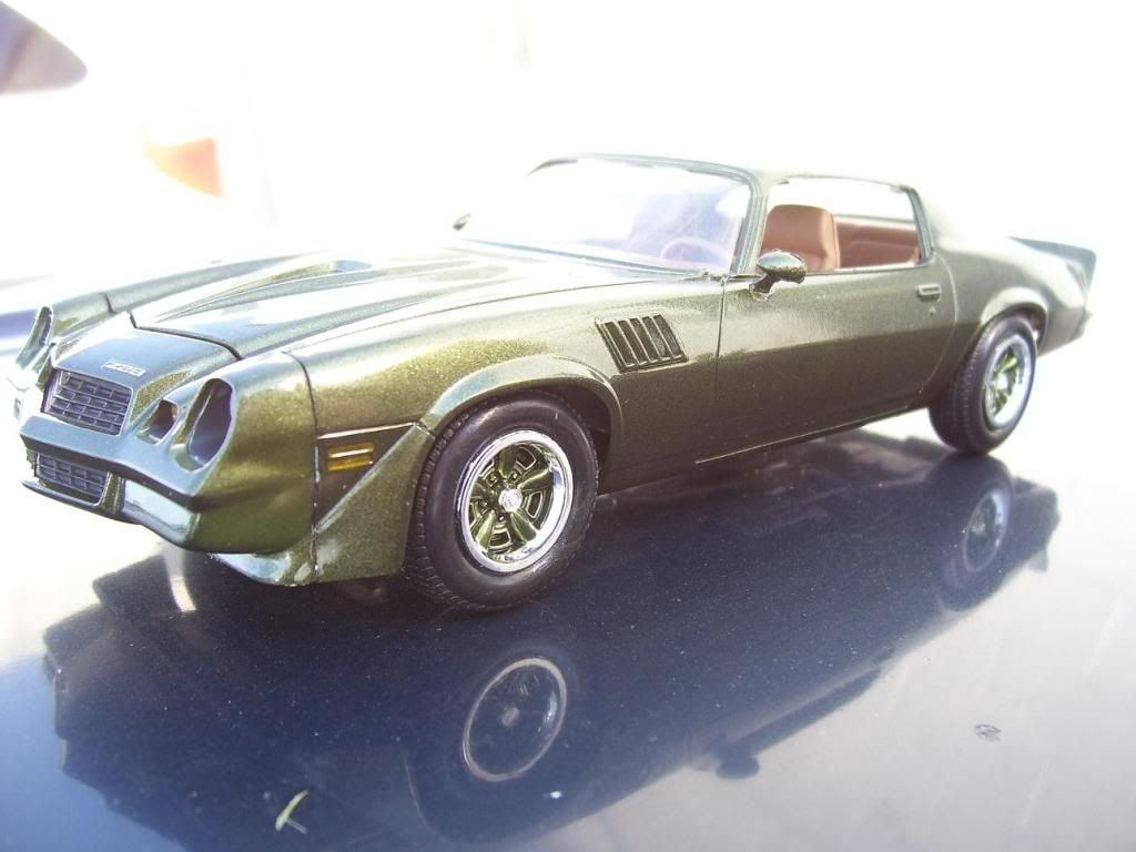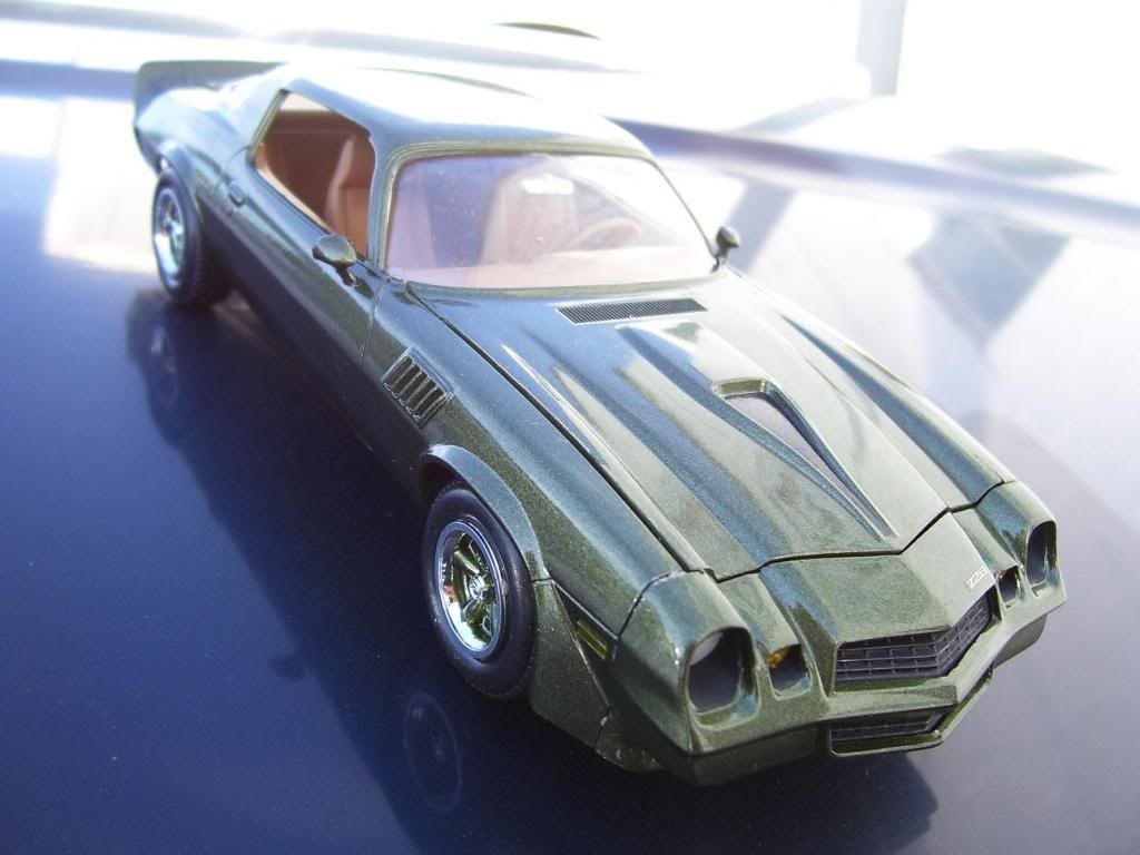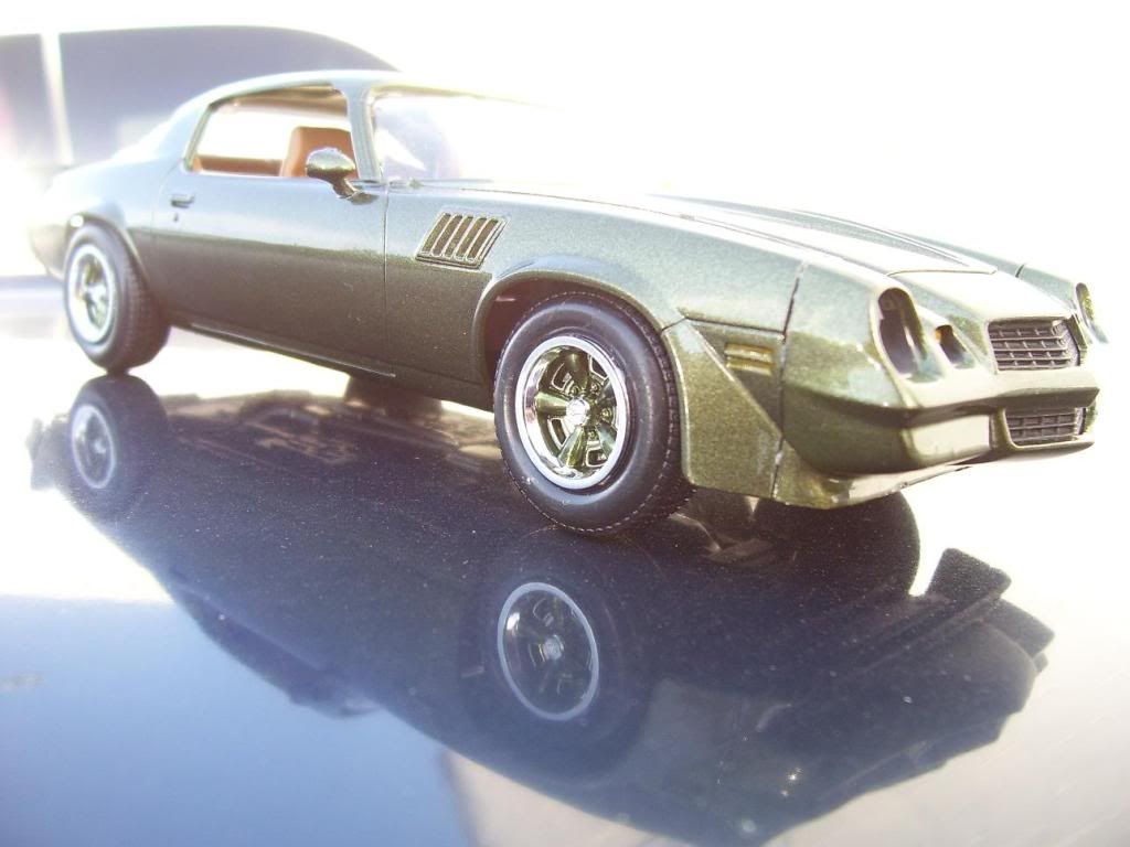I took the decals off today and took some new pics. I also painted the wheels body color. It was pretty sunny today so the metallic on the model is real apparent. The finished car will not have as much metallic. I had to spray very thin very light coats so not to melt the plastic. The reducer in the base color would melt the model if I sprayed it as I would the car. When you do light dusting sprays with metallic paints, you get a lot of metallic. Anyway, the car looks good without stripes too. I may throw a pair of '70 Z28 grille emblems on the fenders when shes all done. Let me know what you guys think now that you can see it without the stripes.