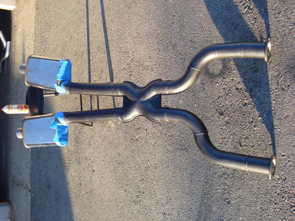 Here's my custom deal. It's all 3" with aluminized mandrels, magnaflow x, magnaflow 5x8's and flowmaster tail pipes that were cut off just below the lower edge of the quarter.