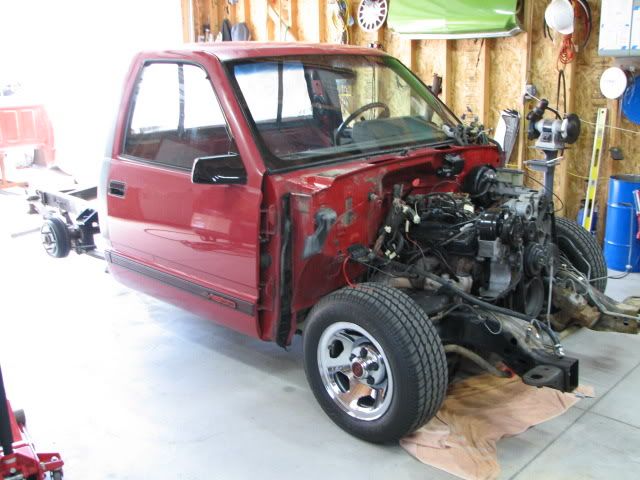 I started tearing the truck down last weekend. I will probably go back with the leaf spring suspension for now (money or lack of) 4/6 drop. I'll put poly bushings where I can and I picked up a rear sway bar from a 99 Tahoe that will be installed. I'll post pics of the sway fab and install. Here are pics of the tear down.