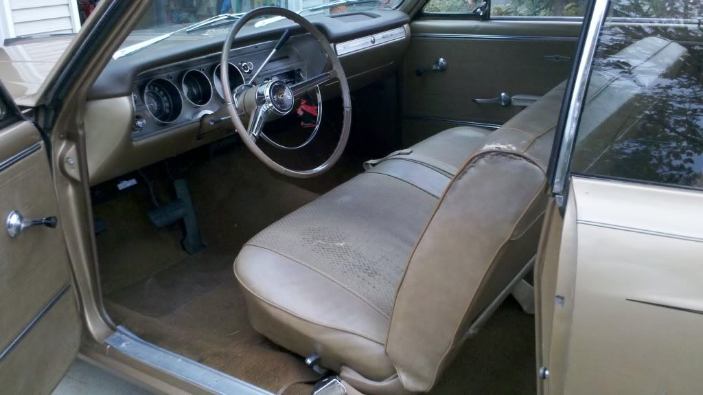 Thought I'd post a few pics of what I started with. Found it on CL, it was a second owner 64k mile car. The second owner only had it for less than 6 months. He was in his late 60's and was what I'd call a tinkerer. Had a little shop in his garage where he could spritz up a few areas and try to make a few bucks on a sale. Unfortunately, he threw a little "fudge" as he called it, over some rust and sprayed over it. Both front fenders need lower patches as did both lower quarter panels and the trunk pan was full of pinholes. The floor pans are very solid though.