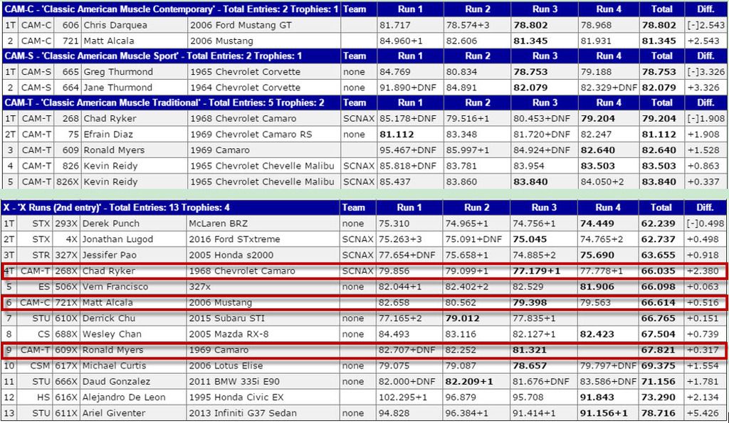 Yesterday marked the 2nd monthly CalClub autocross and my first time making it out. We had 7 CAM cars show up CAM C - Matt A. in his late model mustang that he calls "the rental car." CAM S - Jane T. in her 64 Corvette (Scarlet) CAM S - Greg T. in his 65 Corvette (Scar) CAM T - Efrain D. in his 69 Camaro CAM T - Ron M. in his 69 Camaro (making his SCCA debut!) CAM T - Kevin R. in his 65 Chevelle CAM T - Myself in the 68 Camaro The weather was beautiful low 80's SoCal day, perfect for autocrossing. http://i1380.photobucket.com/albums/...psbcwqzx5o.jpg The course yesterday was HUGE (times of almost a minute and a half)! The 2nd biggest course I've done and one of the big reasons I love going to the SoCal SCCA events. Both the CalClub region and San Diego region consistently create one minute plus courses with a lot of variety. http://i1380.photobucket.com/albums/...ps5vtvhik2.jpg With such a long course DNF's were in vogue, though I think at least one or two of them were bad calls but everyone ran their best time without a DNF so it was all good. In CAMT Efrain came out of the gate swinging and jumped into the lead in the first set of runs and kept that position for the first 3 of 4 competition runs. It wasn't until the 4th run that I managed to leapfrog him into 1st. In CAMS, Greg ran the fastest time of any of the CAM cars during the competition runs. Everyone loved Greg's car, including the announcer. Matt was up against another late model Mustang in CAM C who was on the RE71 tires and ultimately Matt wasn't able to catch him. Here are the Official Results for the CAM cars as well as the X-runs that we did later. http://i1380.photobucket.com/albums/...pssezpdt1x.jpg And here is a video of my 77.8 second x-run. And one final pic Ron took in the hot pits. http://i1380.photobucket.com/albums/...pswevh5xt6.jpg Thanks everyone for coming out! Hopefully, I see you again plus some of the other local autocrossers at future CalClub events. PS. this is the same lot the CAM Challenge will be held in April so as you can see the courses possible in this lot are awesome! |