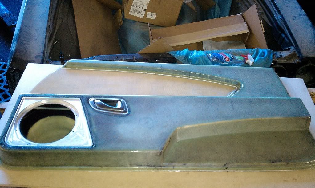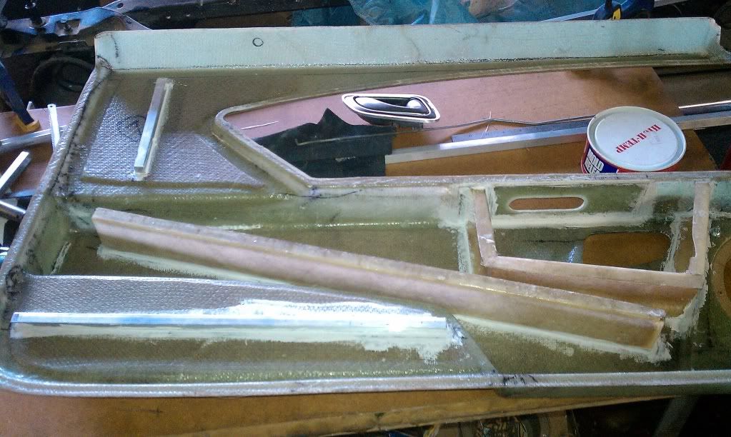 Some progress. I had to change things around a little because the speakers I was going to use are being discontinued. I could not sit around and hop that something would fit by the time the car was finished so I just added as much depth as the door would allow. The downside being having to cut the door a little. I made molds for internal bracing and speaker depth. After popping the parts out of the molds I got the bracing bonded in. I then machined the base for the base for the lock knob trim. Hopefully by this time next week I will have mounted the base and finally bonded the panel together.