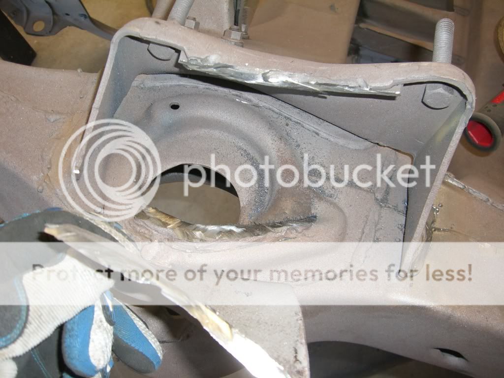 http://i490.photobucket.com/albums/r...e/CIMG3364.jpg Getting rid of the last of the junk attached to the UCA mount http://i490.photobucket.com/albums/r...e/CIMG3455.jpg .....and finally all cleaned up. http://i490.photobucket.com/albums/r...e/CIMG3453.jpg http://i490.photobucket.com/albums/r...e/CIMG3458.jpg The next step is to remove a portion of the spring pocket. This will open up the top of the subrame and allow enough room for the coilover to pass through to the bracket after we attach it. You'll need to open this up to roughly 4 inches in diameter. I went a little wider for an extra margin of clearance for the shock/spring. You can see the red line guiding my cut below. http://i490.photobucket.com/albums/r...e/CIMG3380.jpg |