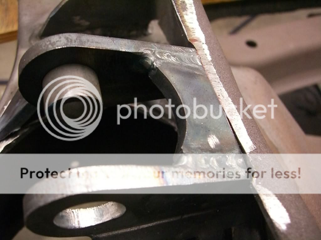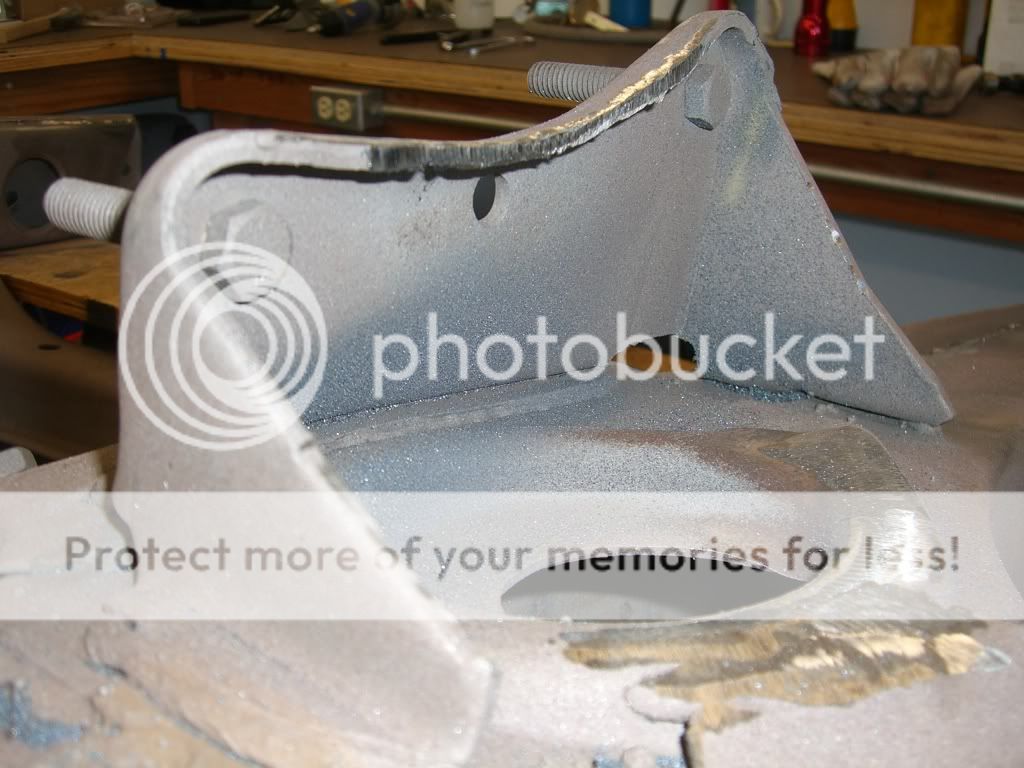 Here is the bracket: http://i490.photobucket.com/albums/r...e/CIMG3370.jpg A darned robust little item if I do say so. 1/4" steel plate (how do you bend this stuff?) nicely mig welded into an assembly that I'm pretty sure could support the weight of the car a couple times over. I have at my disposal a small Kobalt air compressor and cutoff tool. A cheap Sears Craftsman grinder (with cutoff, grinder, wire and flap-disk wheels), a sawzall, a Miller 175 welder and a little something I borrowed from work that we'll get to later. By no means professional quality stuff. IMO your basic homebrew fab tools. Since this the install is done twice (left side and right) I've decided to examine two different ways of accomplishing the task. Here is what we start with: http://i490.photobucket.com/albums/r...e/CIMG3393.jpg The sandblasted subframe and it's OE single shear shock mount and upper control mount. The first step is to remove the single shear shock mount. At first I tried using the pneumatic cutoff tool......lesson learned here. Cheap air compressors and pneumatic tools are just that....cheap. The $200 compressor from Lowes (Kobalt brand) just does not have the ooomph to handle this. It couldn't keep up with the cuttoff tool. So I switched to ol' reliable. Sears. http://i490.photobucket.com/albums/r...e/CIMG3439.jpg The Craftsman grinder with a 4.5" cuttoff wheel made quick work of the shock mount. http://i490.photobucket.com/albums/r...e/CIMG3446.jpg But it does leave a lot of material behind. The lap-welded portion on the subframe arm partially surrounding the spring pocket and the portion still attached to the UCA mount need to be cleaned up. http://i490.photobucket.com/albums/r...e/CIMG3451.jpg No worries...I am using both hands on the grinder (with eye and ear protection). My wife leaned over my shoulder with the camera to take the photo. |