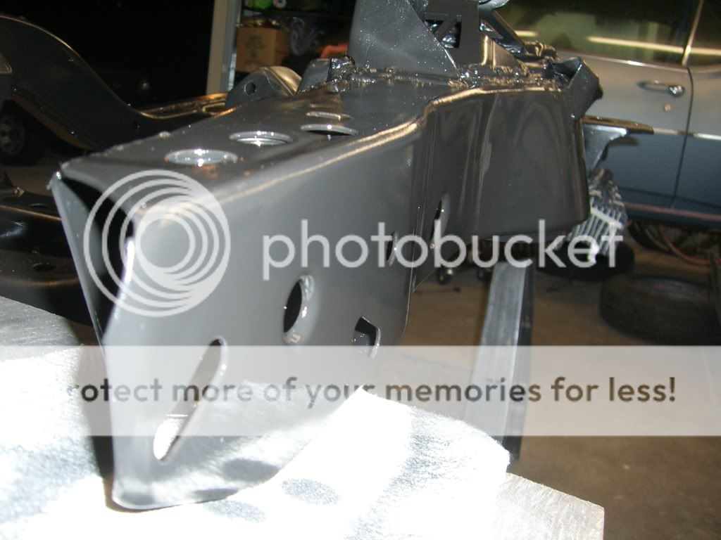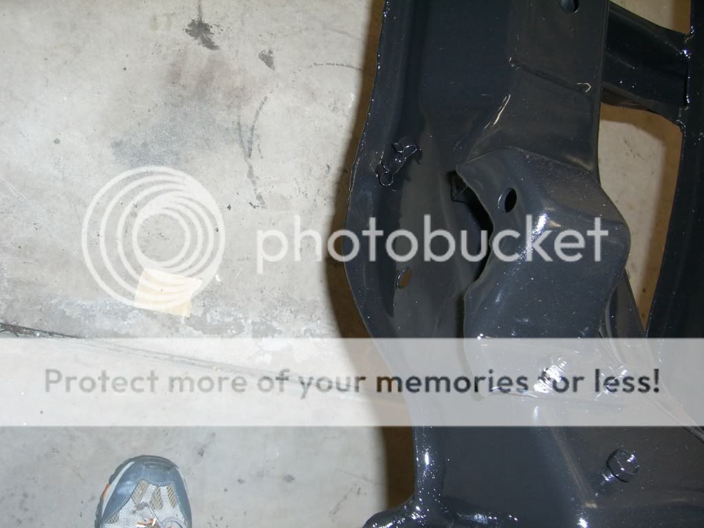 - "Pre" surface cleaner/degreaser - Eastwood "Rust Converter" - Eastwood "Rust Encapsulator" - Eastwood "Chassis Black" (gloss) - Eastwood "Underhood Black" (satin) - One of those "Can-gun" gizmos Really easy to order from them. I used their online ordering this time and it was pretty painless. I have ordered by phone from them as well and it went well too. You get a confirmation email with tracking number so you know when the stuff will arrive. After calling them for more info about the rust treatment products I felt that I didn't have any rust that I felt worthy of using the Rust Converter on. So for these two bits I used the Rust Encapsulator, Chassis Black and Underhood Black only. I have some deeper surface rust in a couple of places that I'll try the Converter on later. Nothing serious though....I may blow it off and just flap-disk it down to fresh steel. We'll see. Anyway, I am really pleased with the stuff. As I mentioned previously this stuff is better than any rattle-can material I have ever used. The "Rust Encapsulator" was used as a primer and I followed that with the Chassis Black on the subframe and the Underhood Black on the Core Support. The Encapsulator and Chassis Black cans both have spray nozzles that project the material in a nice, tight 5" fan pattern at the 8"-10" spray distance called out in the instructions. There is really minimal overspray and it's very easy to control where the material goes, especially with the use of the "can-gun". Additionally, it was easy to ensure that enough material was deployed for coverage w/o getting so much as to experience runs. Overall I am really happy with the result. Yes, a pro with a paint gun could get better results. Nit-pickers will see the occasional bit of dust in the paint. Yup, my garage isn't 100% clean. But this is the subframe and core support on a track/auto-x car. It's more than good enough for me. So let's have a look at the results: After two coats of the "Rust Encapsulator" the subframe looked like this... http://i490.photobucket.com/albums/r...e/CIMG3557.jpg http://i490.photobucket.com/albums/r...e/CIMG3557.jpg It lays on shiny when wet but dries to a flat black finish. If you top-coat within 36 hours you can spray right over it. Longer than that and Eastwood recommends a light scuff with 300 grit or a red scotch-brite pad. I wound up having to do both due to time constraints and in each case the top coat turned out pretty darn nice. http://i490.photobucket.com/albums/r...e/CIMG3569.jpg http://i490.photobucket.com/albums/r...e/CIMG3564.jpg The flash and the florescent lights in my garage conspire to play hell with the color rendering in a few of these photos so some, like this next one look a bit grey. The surface is a uniform, gloss black though. http://i490.photobucket.com/albums/r...e/CIMG3567.jpg |
