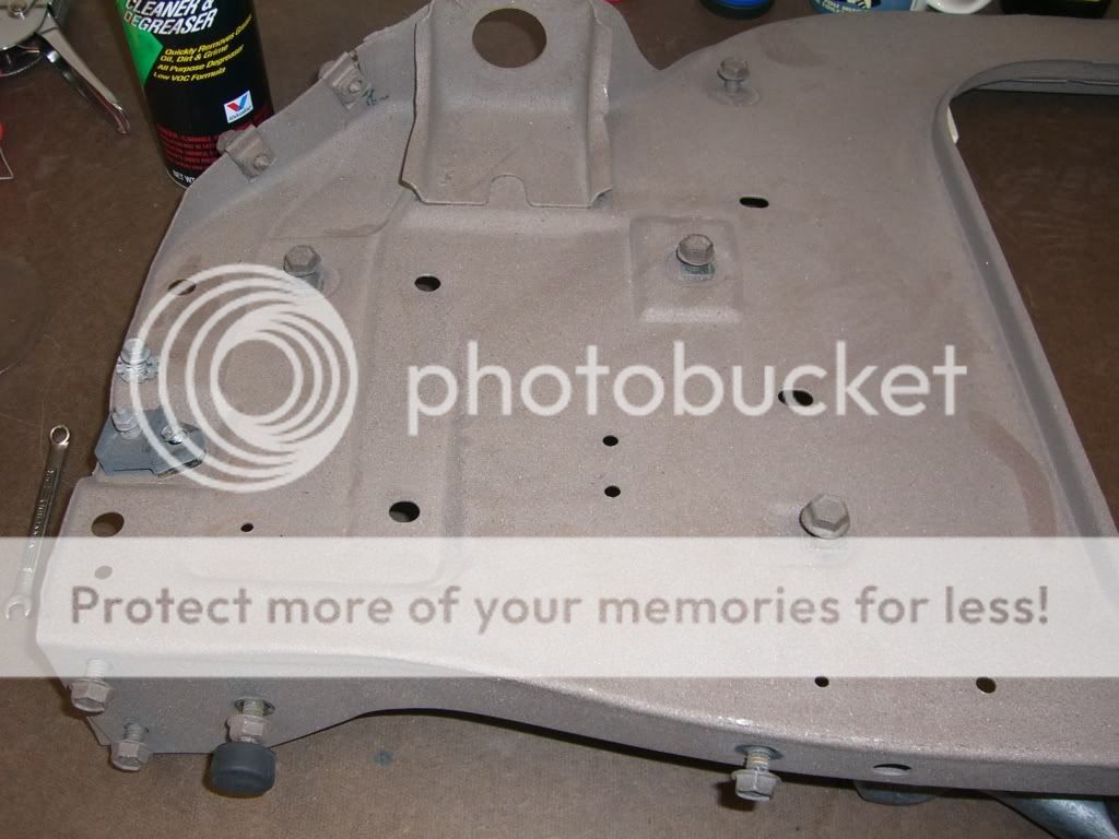 http://i490.photobucket.com/albums/r...e/CIMG3636.jpg [roadbike, mountain bike and downhill bike gathering dust in the background....they hate me] Once you have your marks you then measure diagonally between the marks (left-rear to right-front & right-rear to left-front). The values are sure to be different at first which is why I left the body bushing bolts hand-tight above. You'll have to bump, tweak and nudge the subframe around until the measurements are close to or equal. It'll take a few times to get it right but be patient and make small adjustments. Mine came out exactly equal at 90 1/16" from corner to corner. I compared this to the measurements I took when I disassembled the car. The factory left the differential at 90 3/16" and 89 15/16". A 1/4" out of square condition. I guess that too explains the disparate alignment shim stacks. I left the bushing at the Core Support hand tight to allow me to nudge it around when I put the bodywork back on the car at a later date. http://i490.photobucket.com/albums/r...e/CIMG3632.jpg Next step will be the installation of the DSE subframe connectors. I'm starting on that tonight so we should have at least a preliminary update to this thread in a few days. |